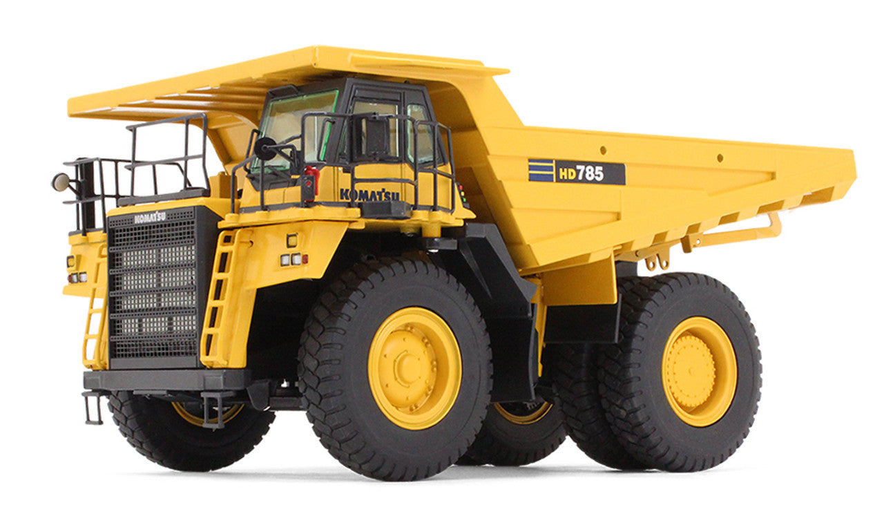 Diese authentische Metallnachbildung des Komatsu HD785-7 Muldenkippers verfügt über ein detailgetreues Bedienpult, eine kippbare Karosserie und gelenkige Vorderräder. Die hochwertige Nachbildung ist gelb lackiert. Die Nachbildung im Maßstab 1:50 ist ca. 20 cm lang, 11,4 cm breit und 9,5 cm hoch.