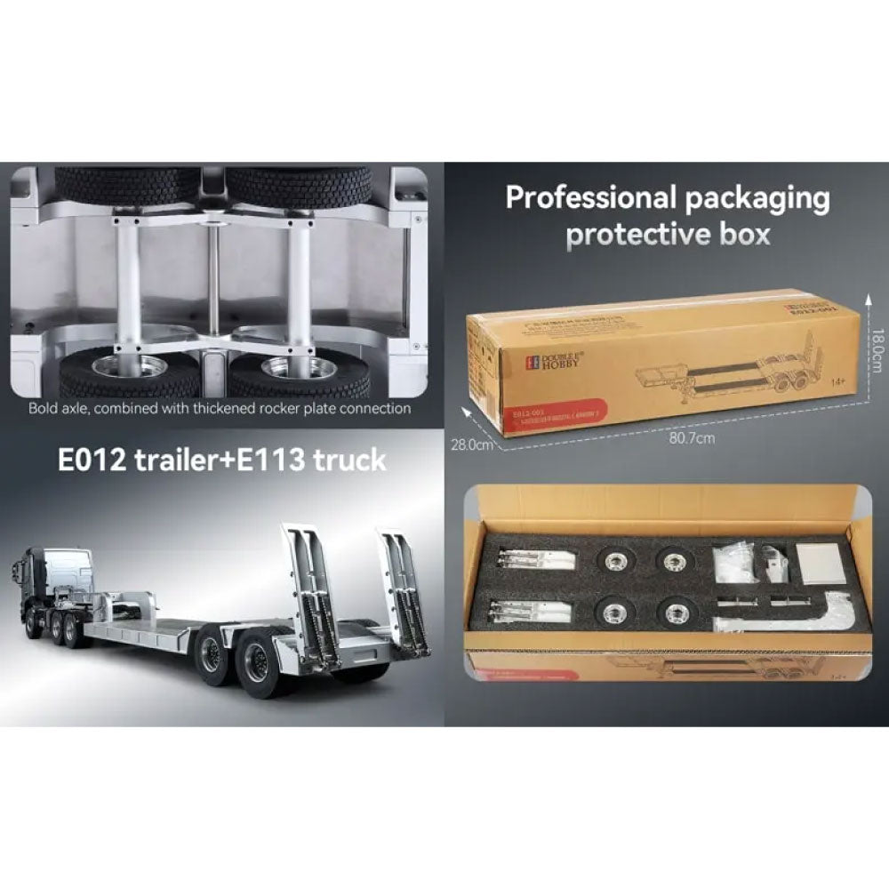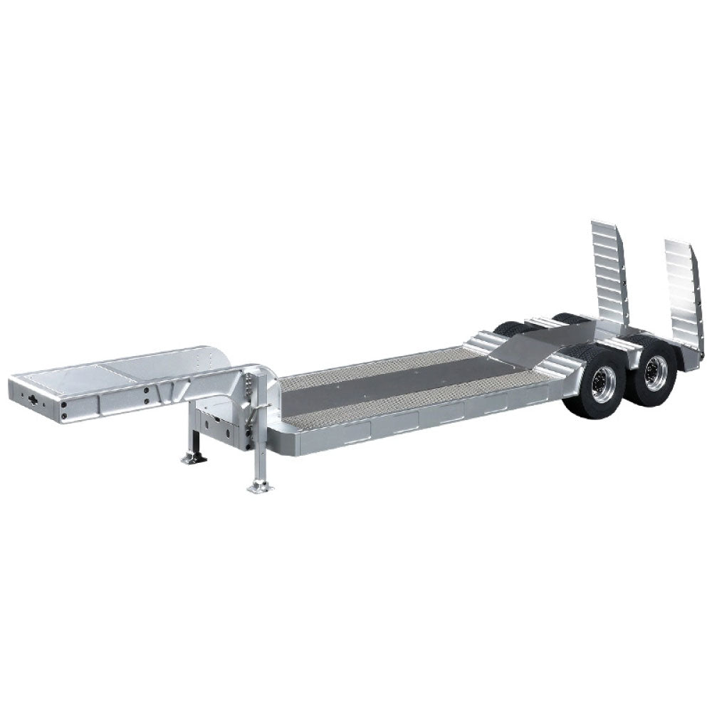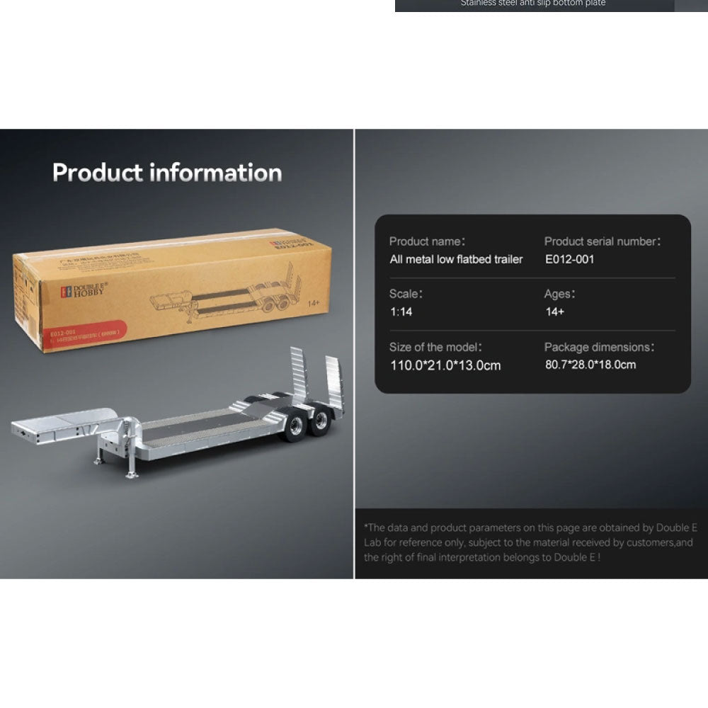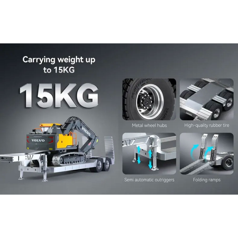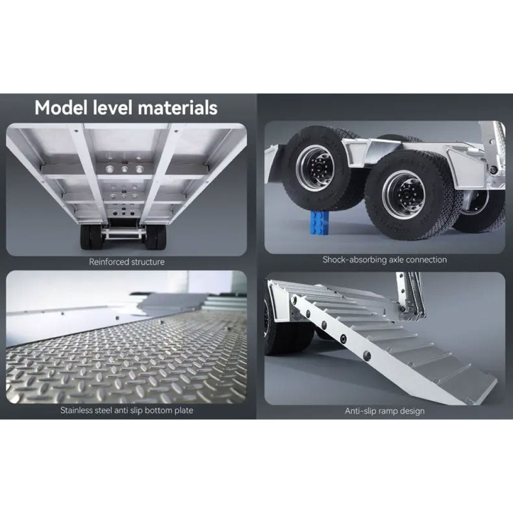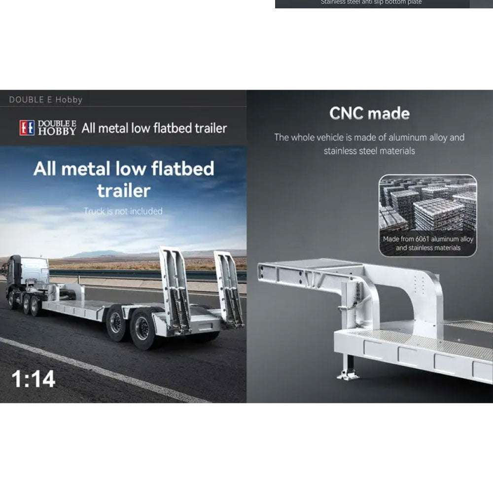 The Double E all-metal lowbed trailer is a premium CNC-machined model designed for durability and functionality. Constructed from 6061 aluminum alloy and stainless steel, this trailer ensures long-lasting strength while maintaining a sleek, realistic appearance. Its non-slip stainless steel base and non-slip ramp provide added safety and stability during loading and unloading.