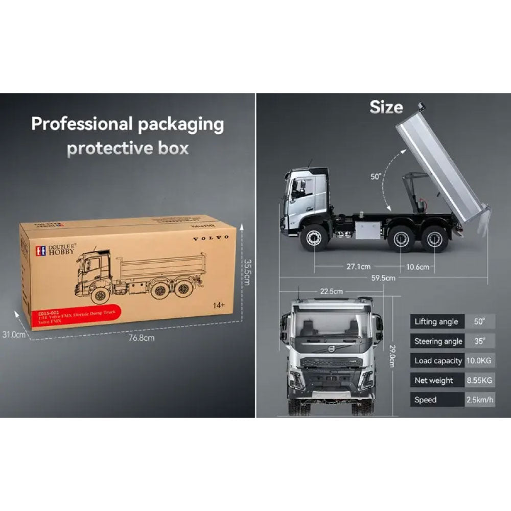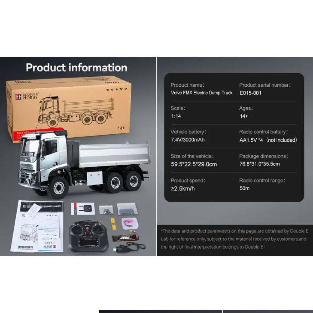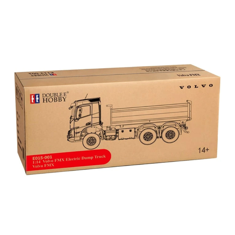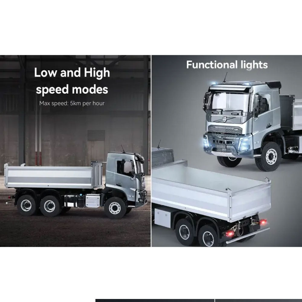 The Volvo FMX Truck Model E015 is a 1/14 scale electric RC dump truck designed for both hobbyists and beginners. This Ready-to-Run (RTR) version features a powerful tail lift capable of supporting up to 10 kg (22 lbs) with a 50-degree tilt, making it perfect for realistic loading and unloading operations. The ABS plastic cab includes opening doors, revealing a detailed interior, and tilts forward for easy access to the electronic components. Designed for durability, the truck's chassis and body are made of aluminum and zinc, while all mechanical parts are steel for maximum strength and durability.