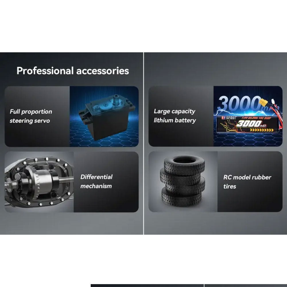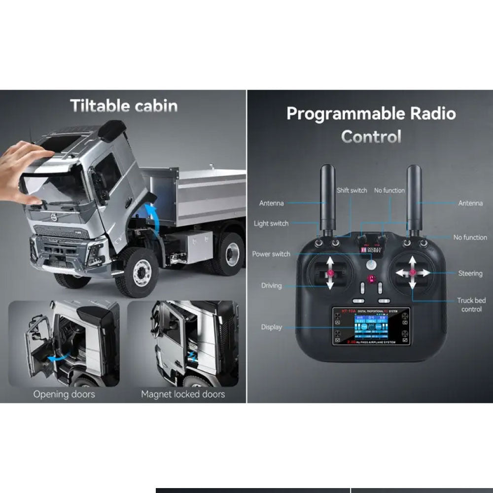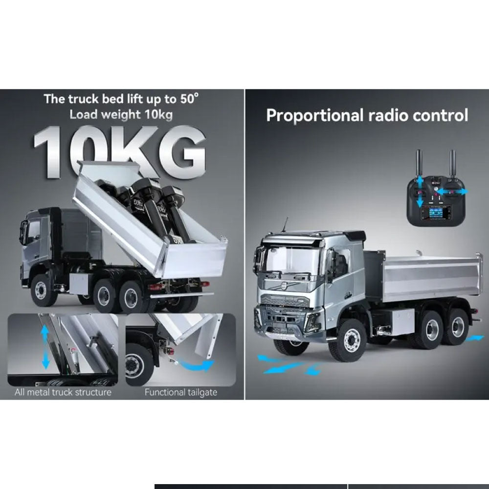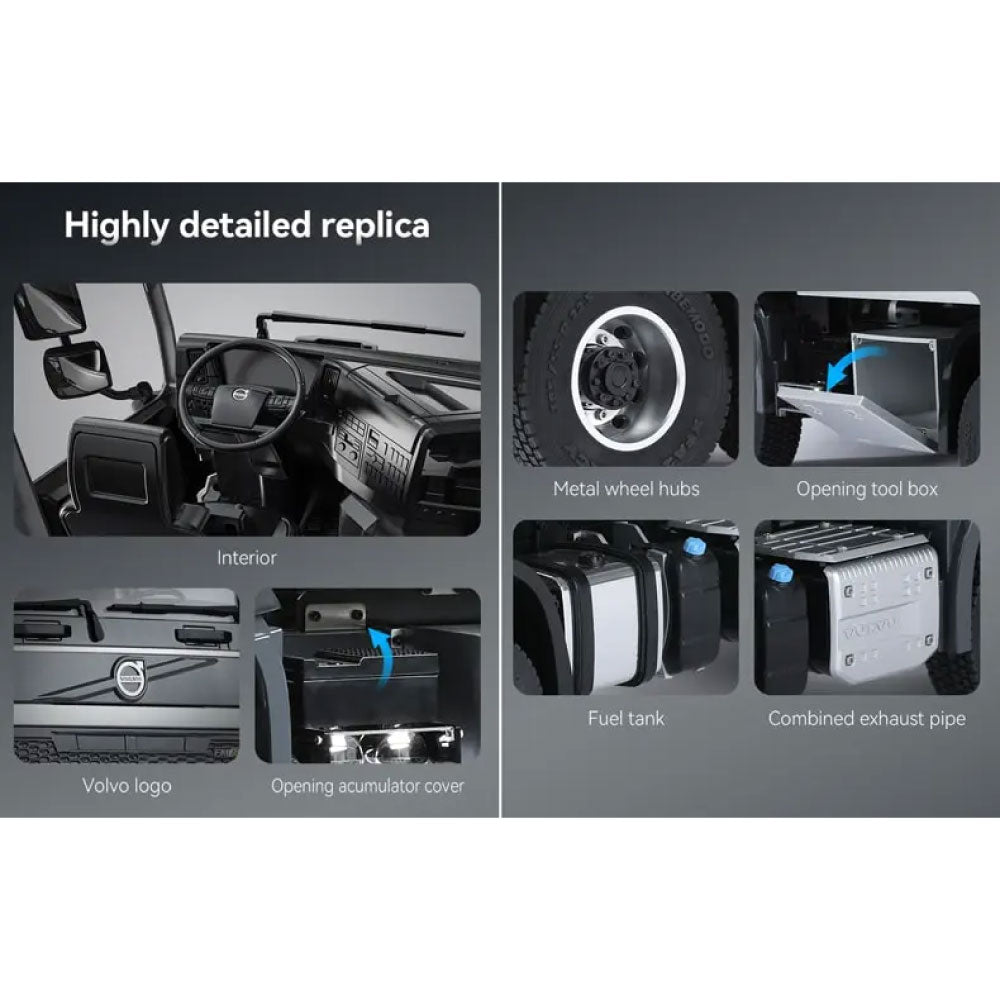 The Volvo FMX Truck Model E015 is a 1/14 scale electric RC dump truck designed for both hobbyists and beginners. This Ready-to-Run (RTR) version features a powerful tail lift capable of supporting up to 10 kg (22 lbs) with a 50-degree tilt, making it perfect for realistic loading and unloading operations. The ABS plastic cab includes opening doors, revealing a detailed interior, and tilts forward for easy access to the electronic components. Designed for durability, the truck's chassis and body are made of aluminum and zinc, while all mechanical parts are steel for maximum strength and durability.