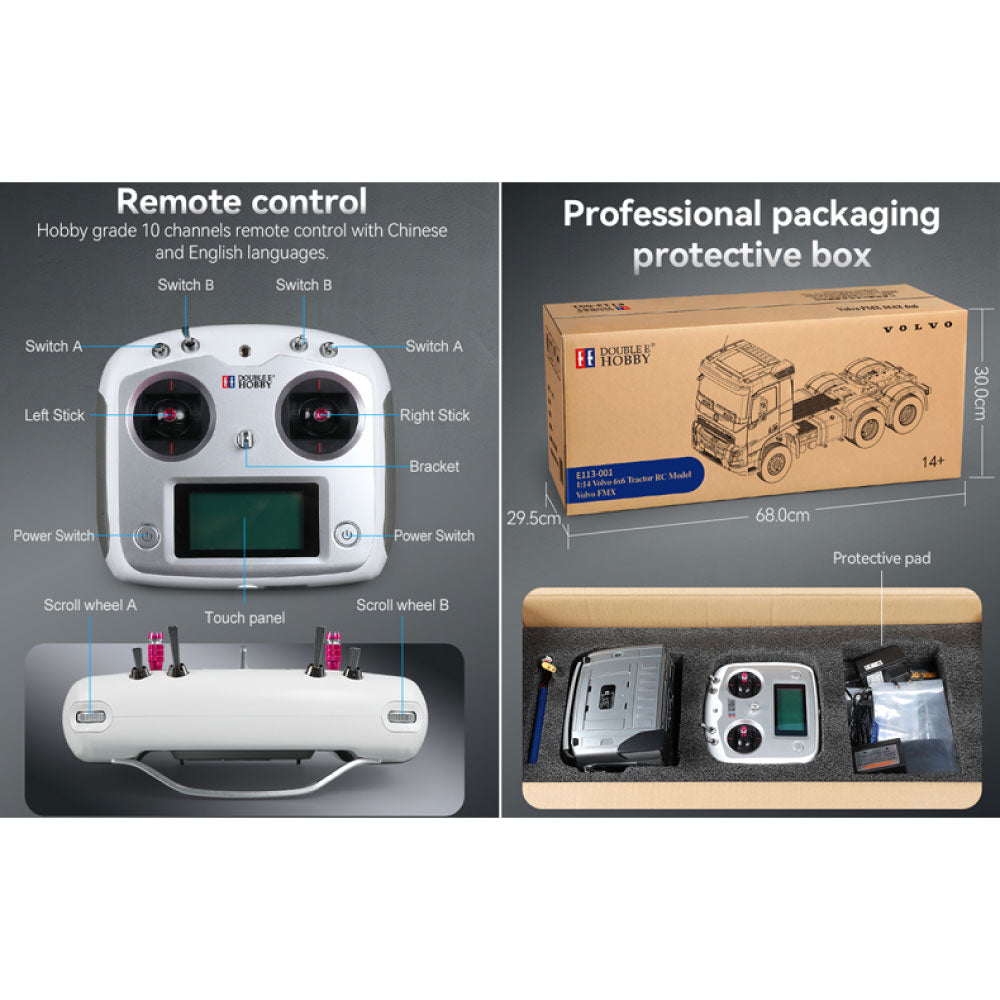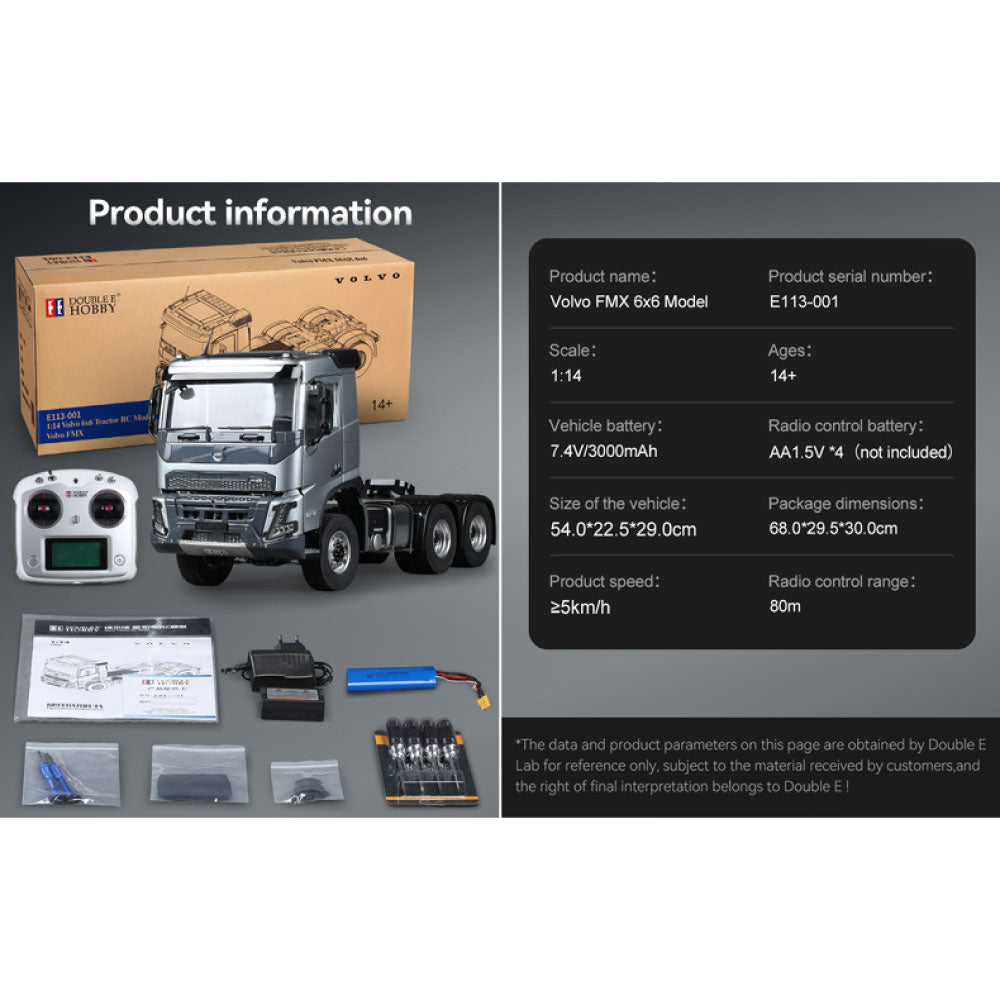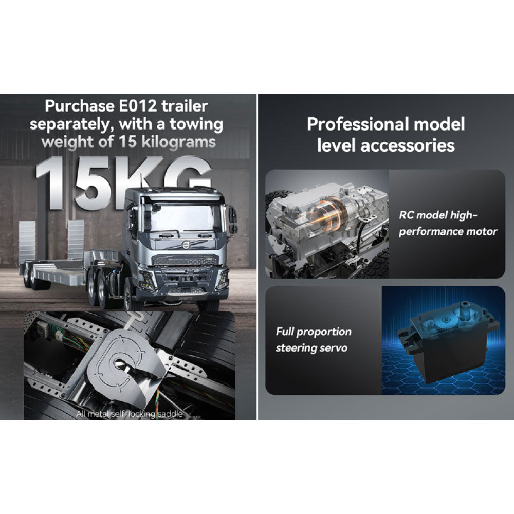 For an immersive experience, the Volvo FMX 6x6 includes work lights and a sound system that bring it to life. This Ready-to-Run (RTR) model comes with a 10-channel radio controller, ensuring you have full control of its functions right out of the box. The package also includes a flatbed trailer (E012), expanding its hauling capabilities.