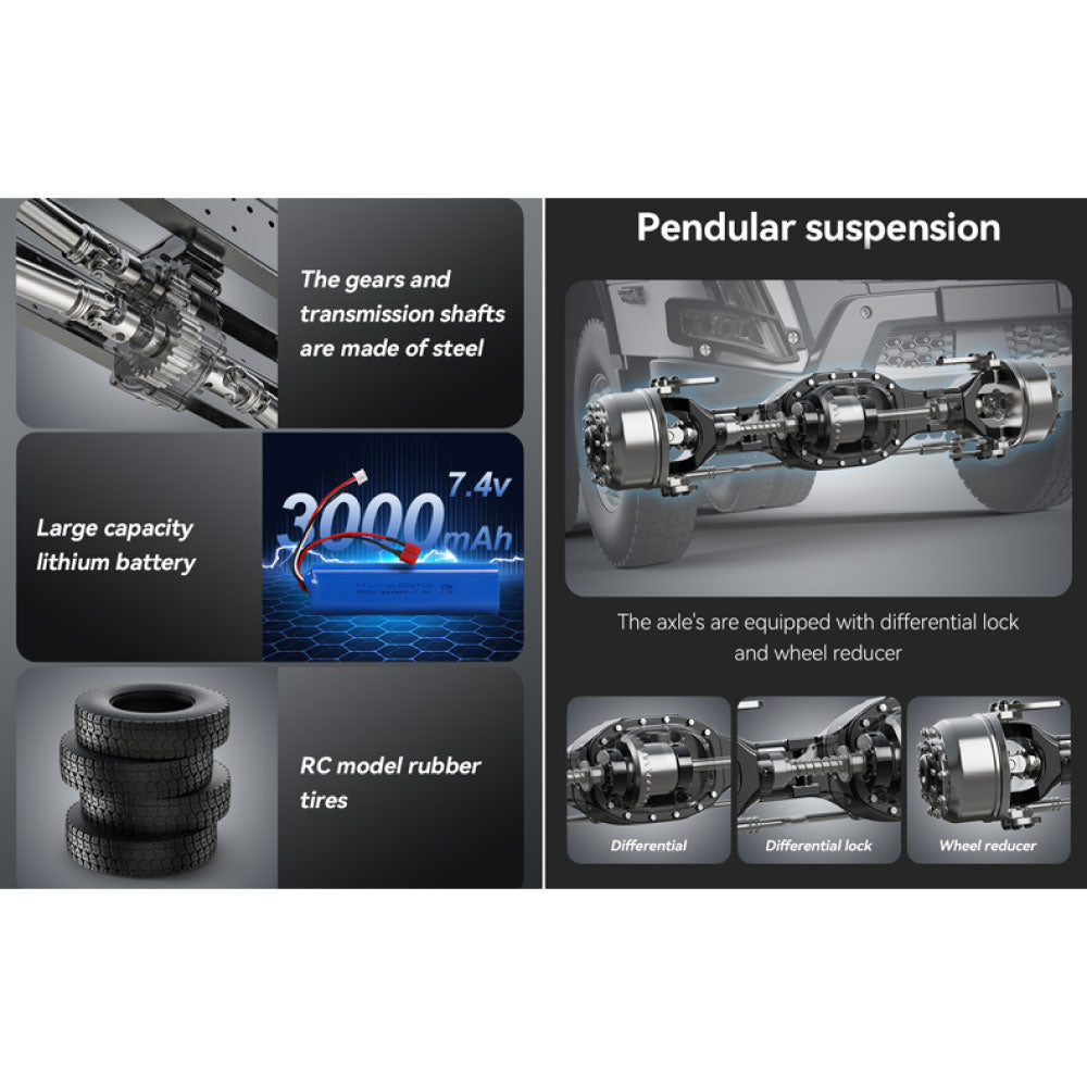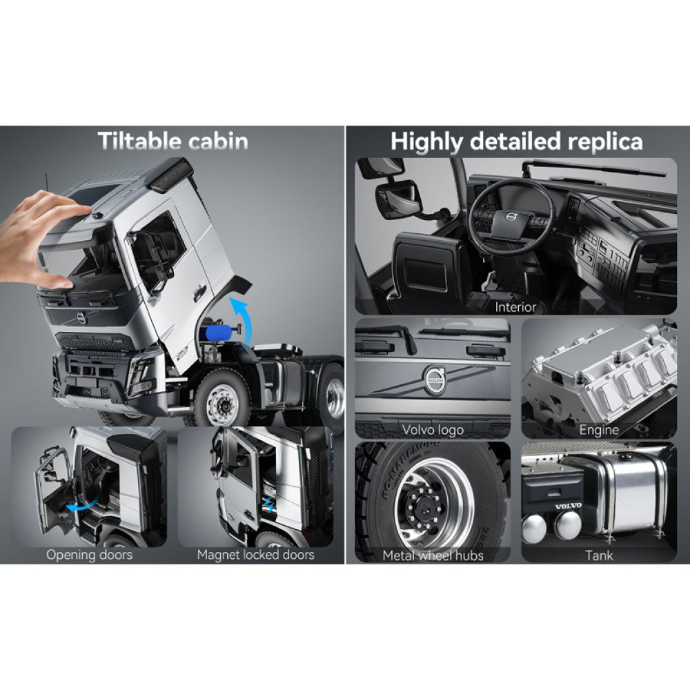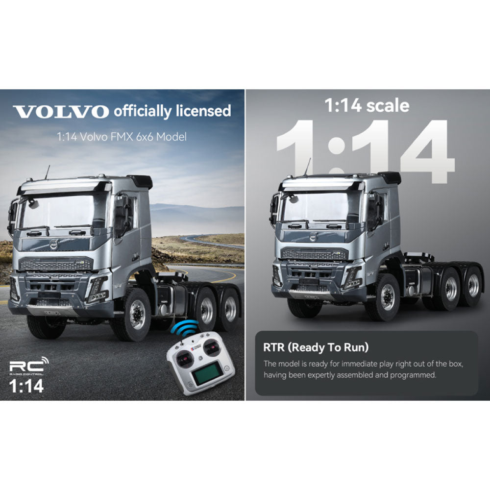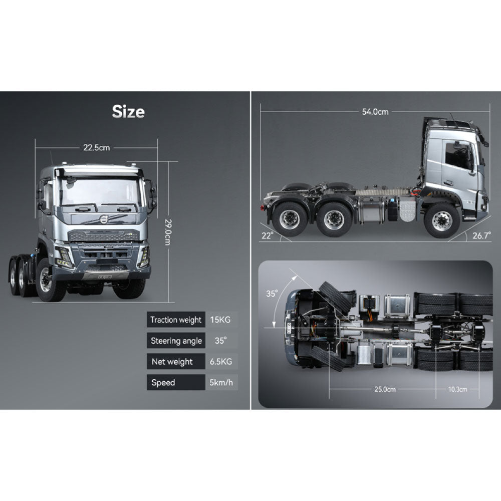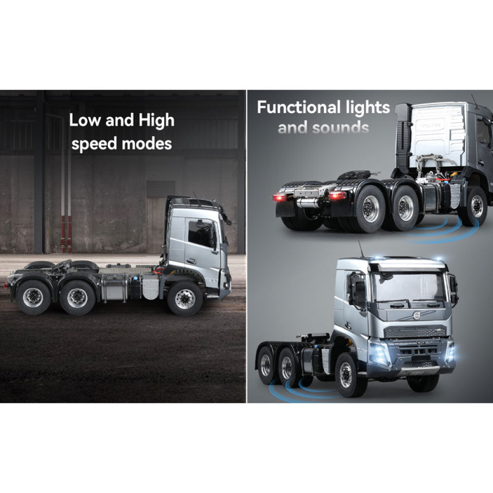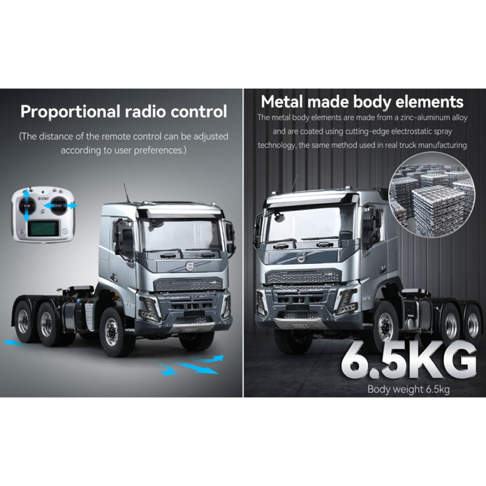 The Volvo FMX 6x6 RC Hauler is a 1/14 scale remote-controlled truck, ideal for hobbyists, designed for the most demanding users seeking realism and performance. Made entirely of zinc and aluminum alloy, this model is highly durable and offers an authentic, rugged driving experience. Weighing 6.5 kg, it is built for power and features a differential, differential lock, and wheel reduction gears to ensure superior traction and control on rough terrain.