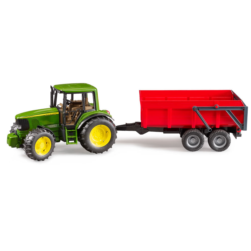 The John Deere 6920 is a powerful and reliable agricultural implement. This model has long been a firm member of the BRUDER range. The engine hood can be opened to reveal the engine block. The all-terrain front axle can be steered directly via the cab's movable steering wheel or via the included steering rod extension, which children can attach to the movable steering wheel through the cab's sliding roof.