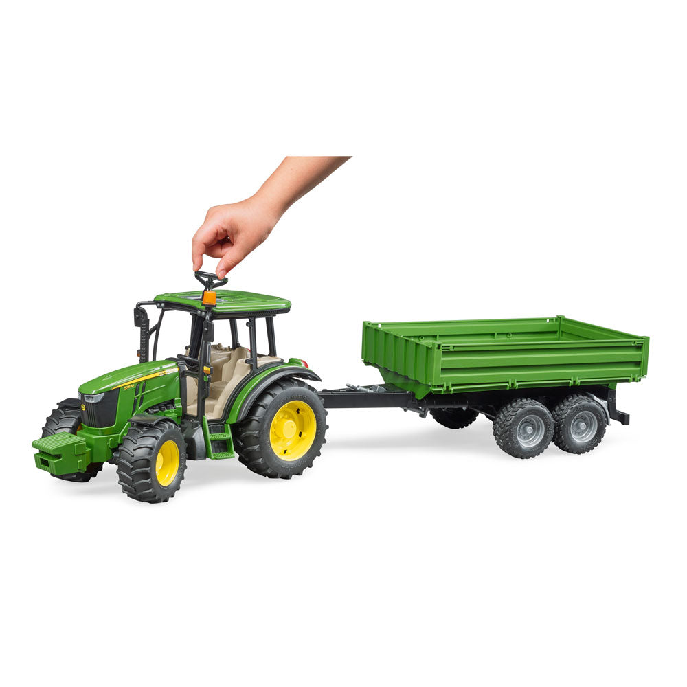The John Deere 5115M is now also available to complement the wide range of John Deere items offered by BRUDER. This model, which belongs to the 1000 tractor series, is impressive not only for its detailed appearance but also for its compactness and maneuverability. Due to its particularly outstanding maneuverability, it is excellent for working, for example, in tight spaces or can be easily parked in the bworld machine hall. The spacious and clearly designed driver's cab has been adapted to the size of the bworld figures and allows them to steer the tractor perfectly. Like all tractors in the BRUDER range, the John Deere 5115M can also be steered using the additional steering rod stored in the vehicle floor, after inserting it into the steering wheel via the cab's sliding roof. The 1:16 scale has also been maintained for this model to create a particularly attractive playscape when combined with many BRUDER products. The removable front weight, in combination with the trailer coupling, can accommodate numerous implements and trailers from the entire range. This set also includes a cargo trailer in John Deere colors. This trailer has a tipping bed and folding sides, as well as a folding trailer coupling and profiled tires. The tractor's functionality can be further enhanced with the separately available front loader (item no. 02319), and the set can be perfectly complemented with the trailer.