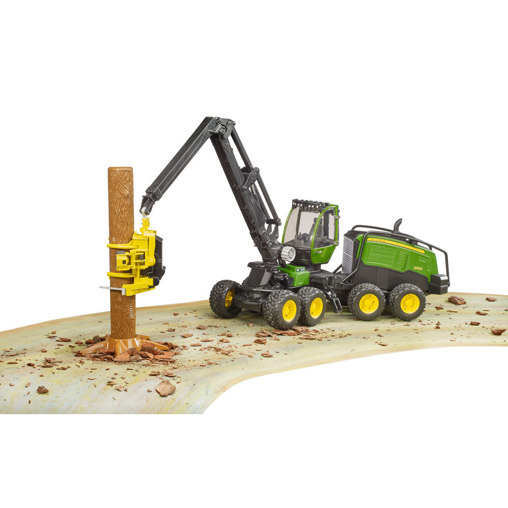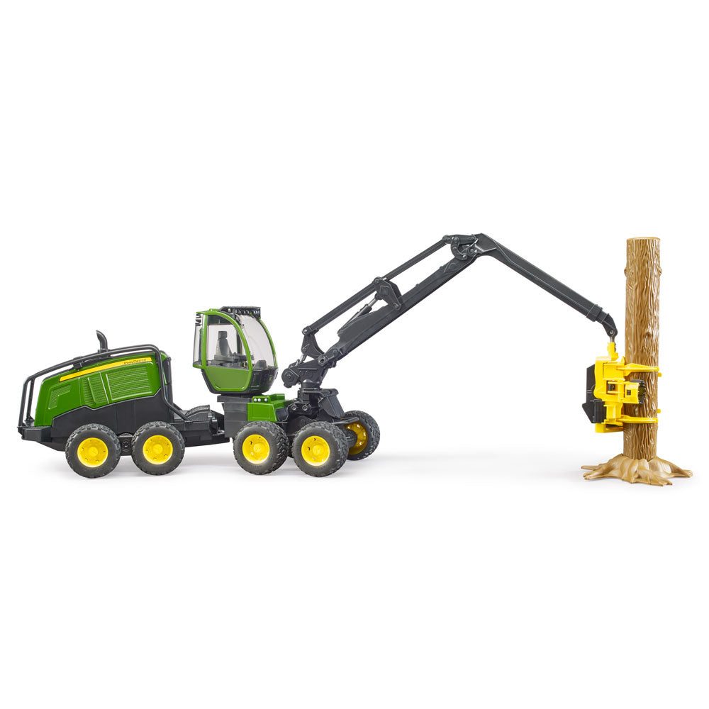 The driver's cab rotates and features a highly modern design, and the optionally available bworld figure climbs into it through the opening door. The chassis is well-equipped with oscillating axles and profiled tires for navigating difficult terrain. The highly detailed harvester unit sits on the fully movable crane arm. This unit features movable grapples, transport rollers, and a saw unit. Children can immediately begin working in the timber industry in a very realistic way, as a tree trunk with a removable stump is included in the scope of delivery. As the perfect complement to this magnificent vehicle, BRUDER offers the bworld forestry worker (item no. 60030) and the MACK timber hauler (item no. 02824).