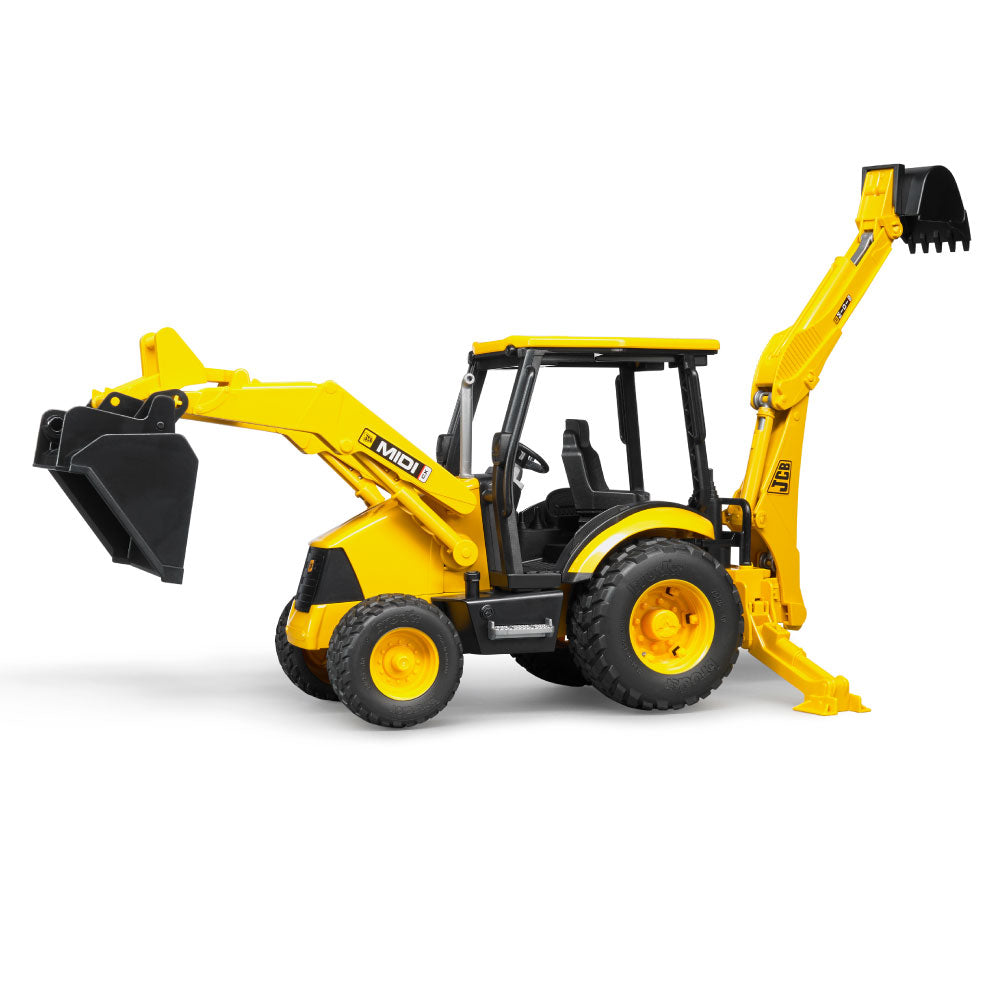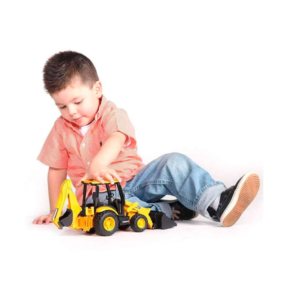 The 50 HP backhoe loader, with a speed of 26 km/h and awarded the Demopark Gold Medal by prominent trade journalists, is small, agile, and can be equipped with classic agricultural implements. It can be used on large and small construction sites and combines three tools in one: a mini excavator, a compact wheel loader, and a compact tractor. This innovative concept makes it an ideal tool for landscaping, as well as for completing a wide range of common tasks in civil engineering. The versatile working options are faithful to the original BRUDER model. For this reason, it actually has a fully functional (and removable) front loader, as well as a fully usable and removable backhoe loading unit with one-hand operation. Two foldable support legs provide stability to the backhoe, the floating axle for any terrain, and tread-resistant tires complete the picture. The backhoe can be provided with a standard tractor coupling to add to the play fun when the front loader is detached, allowing all trailers and equipment from the Agricultural Series to be used.