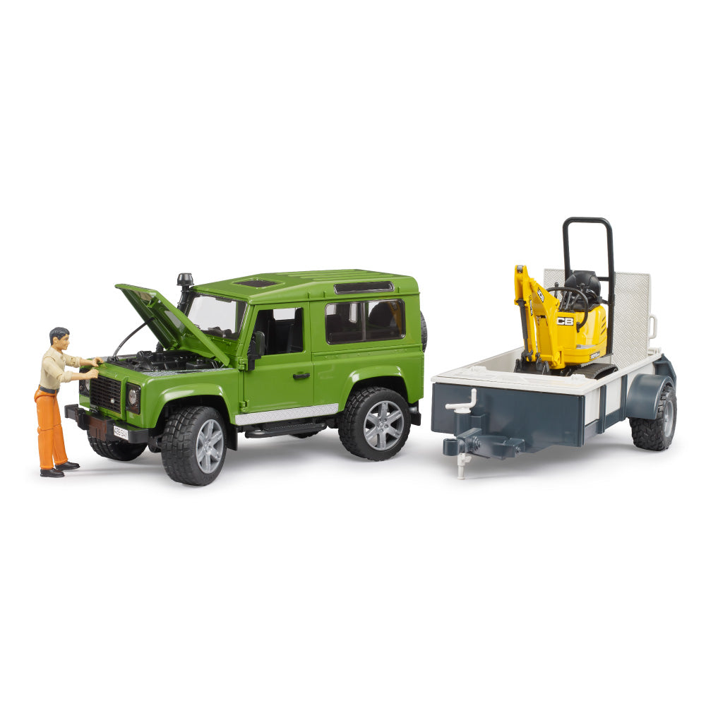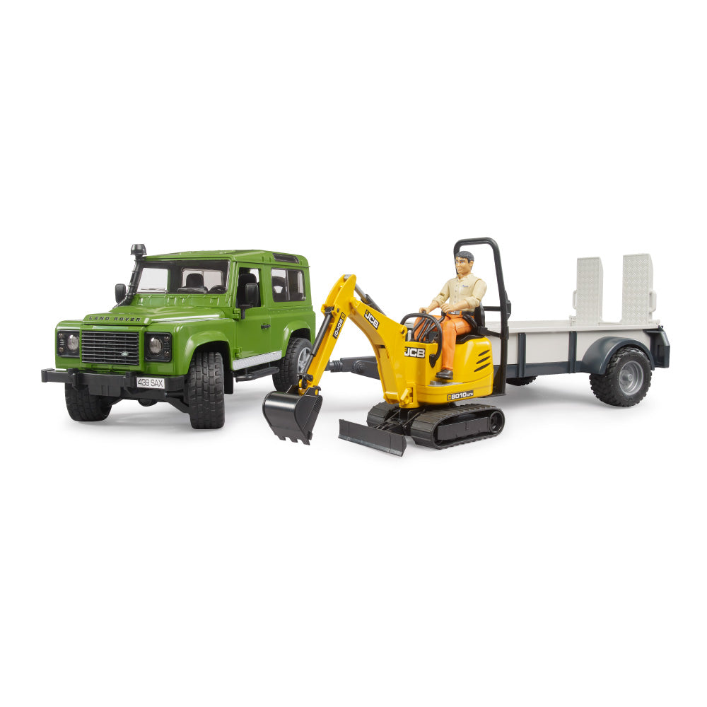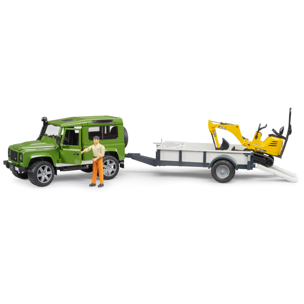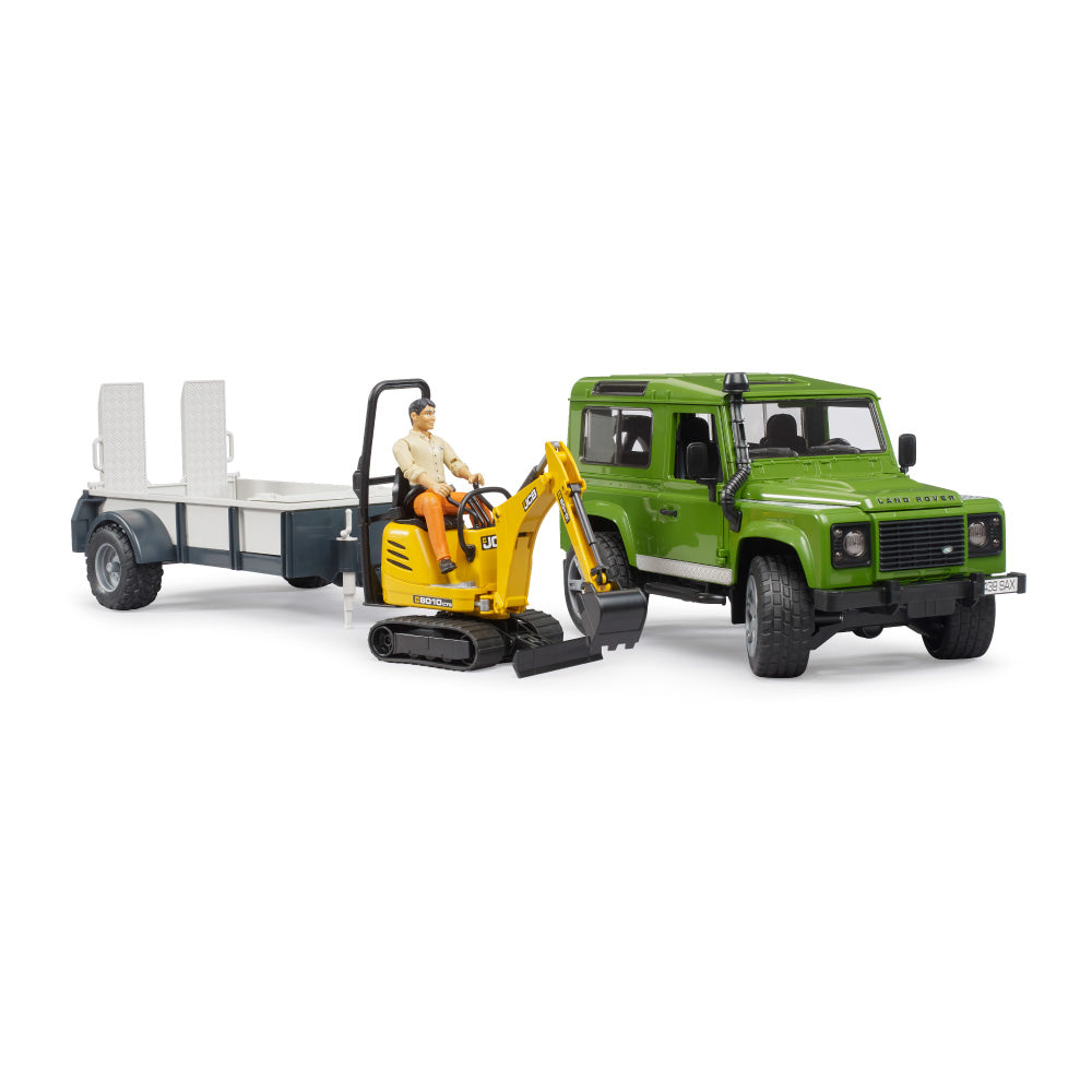 Fascinating off-road quality and timeless Land Rover design combined with the detailed JCB micro excavator from the new bworld series: exactly what little construction workers need. Not only will the resulting model delight Land Rover fans with its surprising details, such as the embossed frame plate on the engine hood and numerous playable functions. The rear and side doors can be opened, and the rear seat can be removed. The matching micro excavator also impresses with its details. All figures from the bworld series fit perfectly in their seats. With the additional help of the rotating chassis, work can be done on any small construction site. The single-axle trailer, featuring an opening tailgate and profiled tires, is also included in the scope of delivery. This set has everything you need, except, of course, the creativity needed to recreate many fascinating situations from the everyday life of construction workers for years to come.
