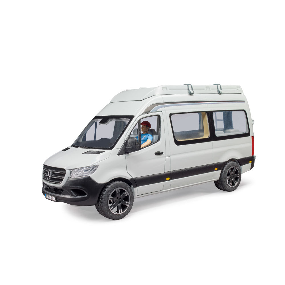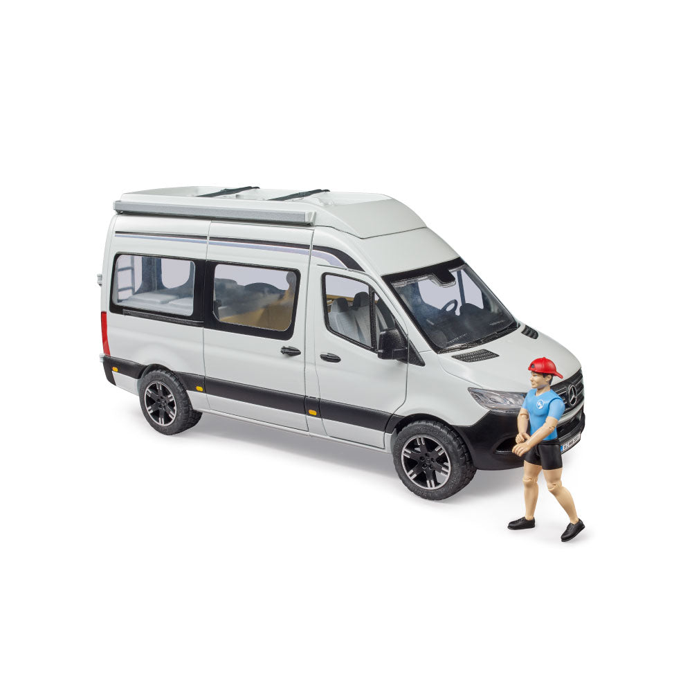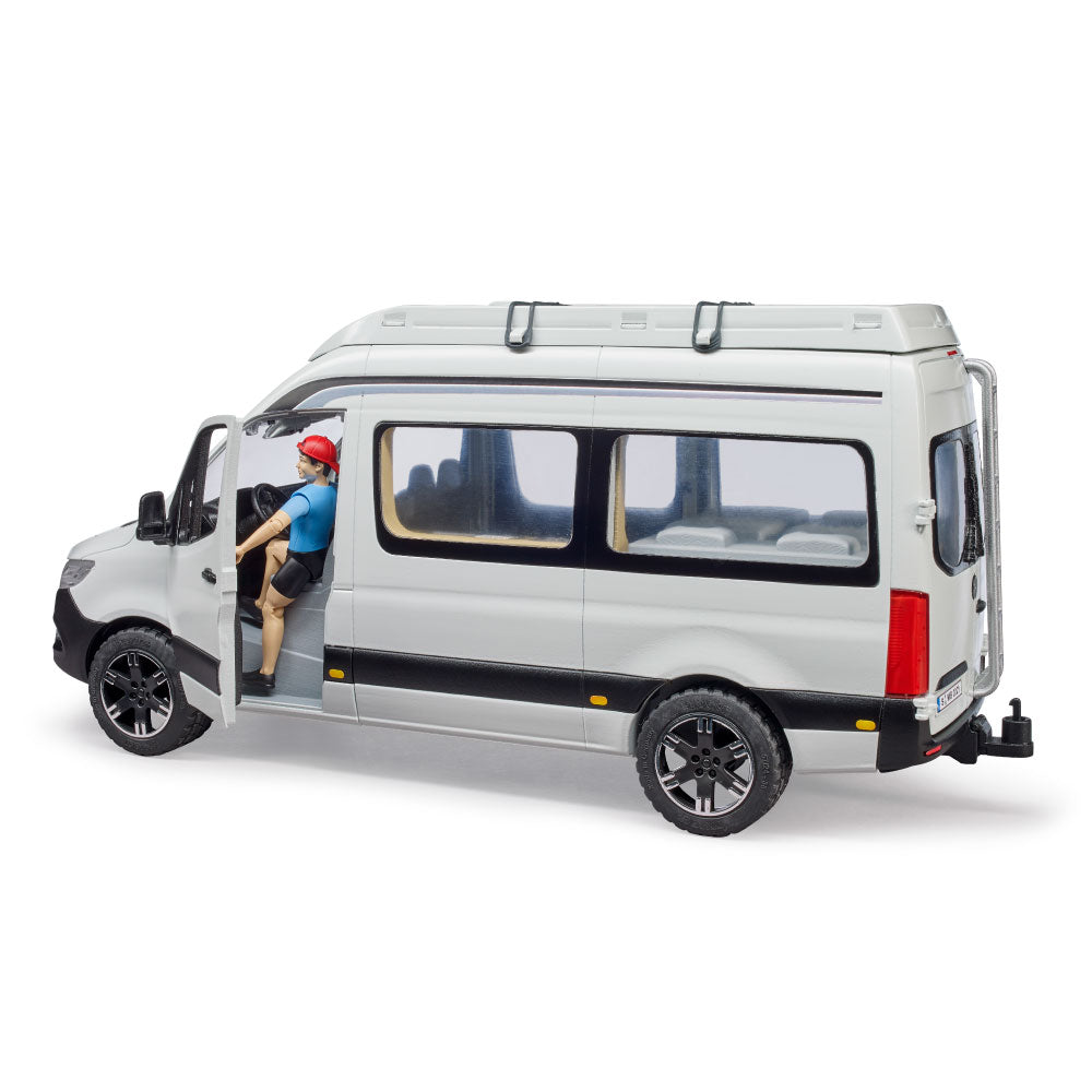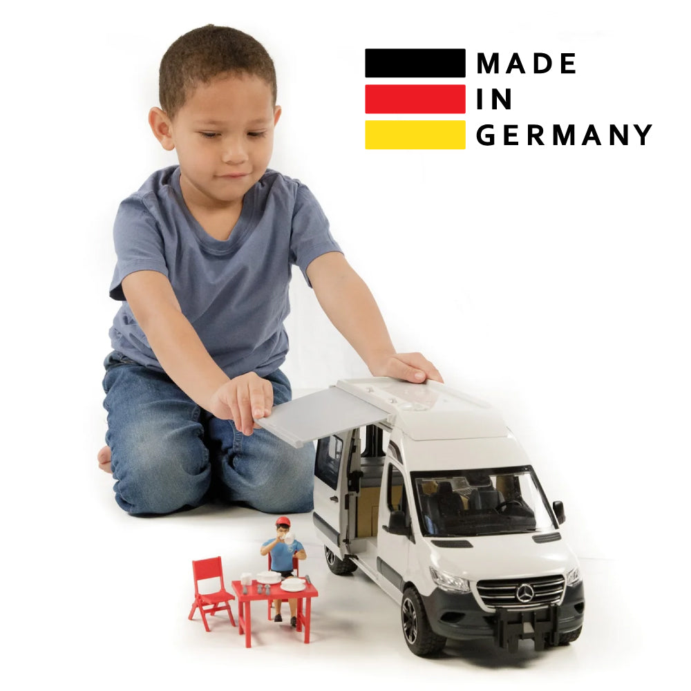 Camping is all the rage. Caravan park permits across Europe reached new records in 2018 and 2019. The little ones can discover this fascinating leisure activity with the new BRUDER camper van. The new Mercedes-Benz Sprinter is also very popular as an entry-level model for motorhomes. The BRUDER version of the new Mercedes-Benz Sprinter camper van impresses with its many details and versatility. The vehicle features opening doors in the driver's cab and rear. Here, the included bworld figure can access the integrated double bed and a large storage compartment. The highlight is the new sliding door on the passenger side, which provides access to the kitchen. For sunny days, the camper has a removable awning, as well as authentic camping furniture and tableware. Fantastic extensions for the camper van are the bworld kayak (item no. 63155), which can be transported on the roof, as well as the bworld mountain bike (item no. 63111) and the bworld racing bike (item no. 63110).