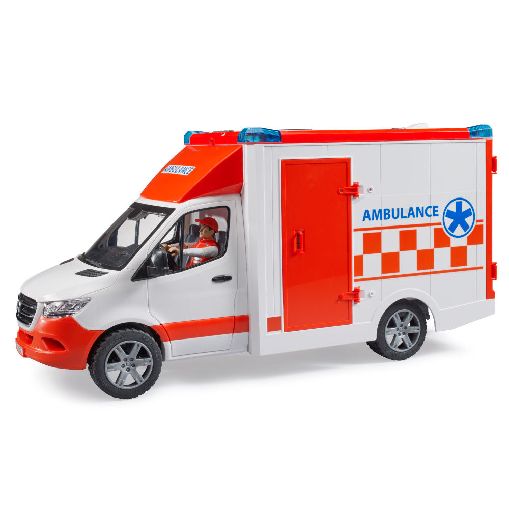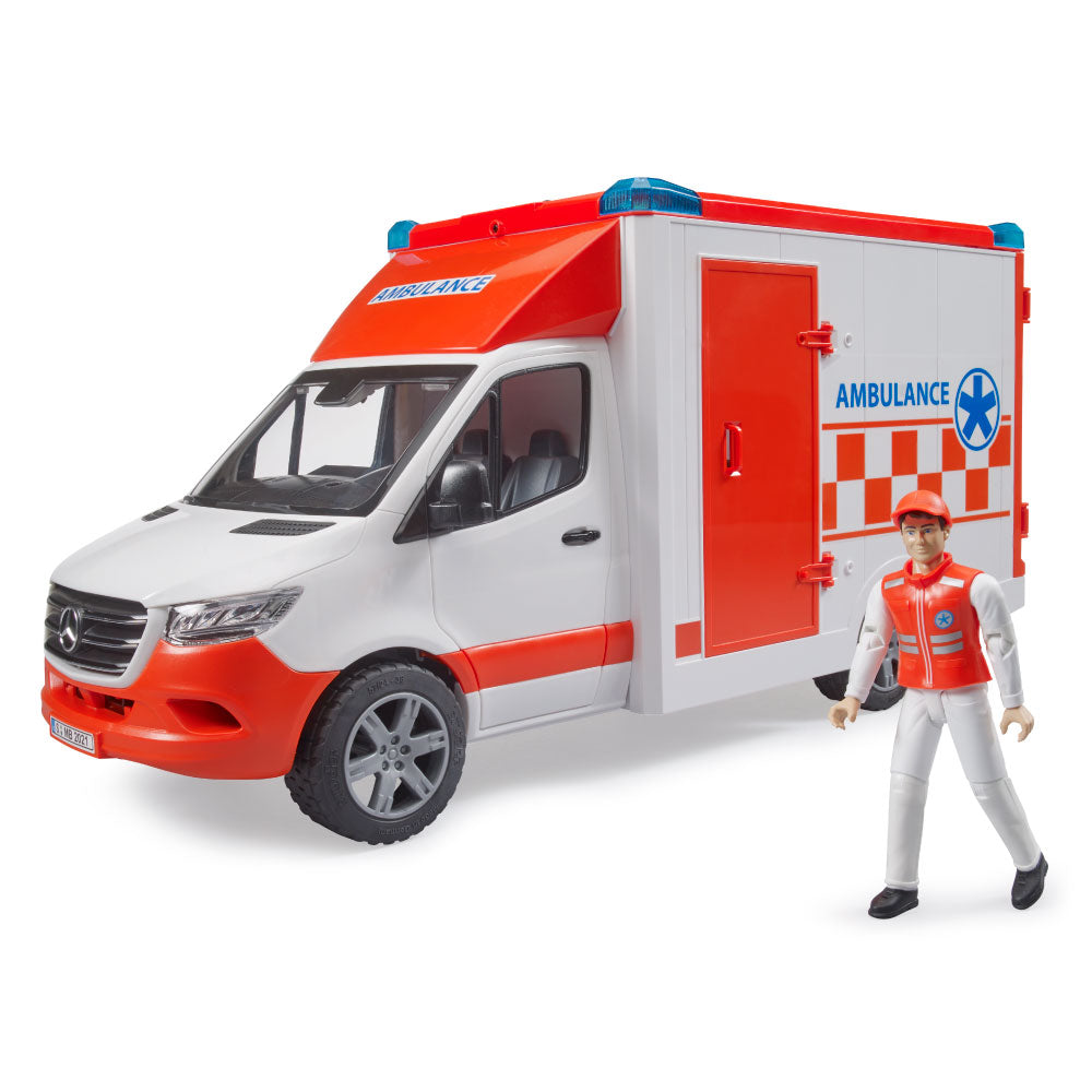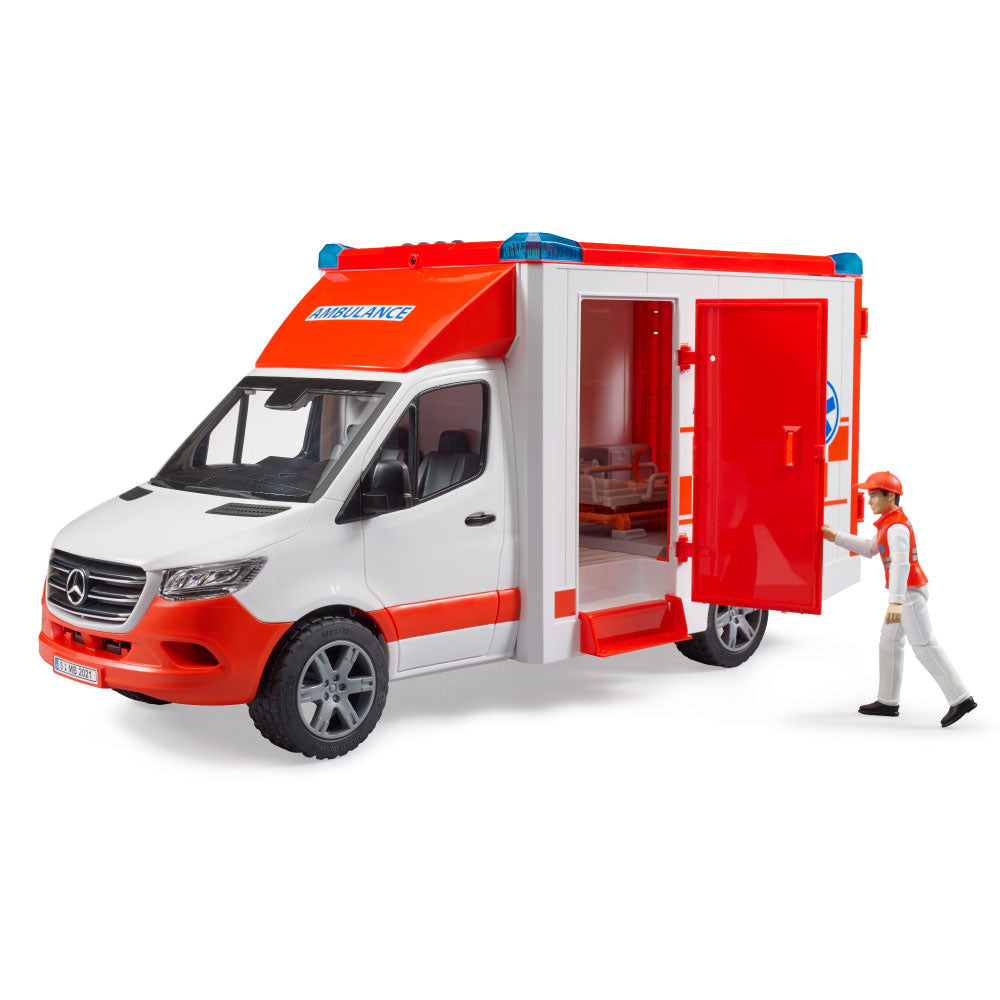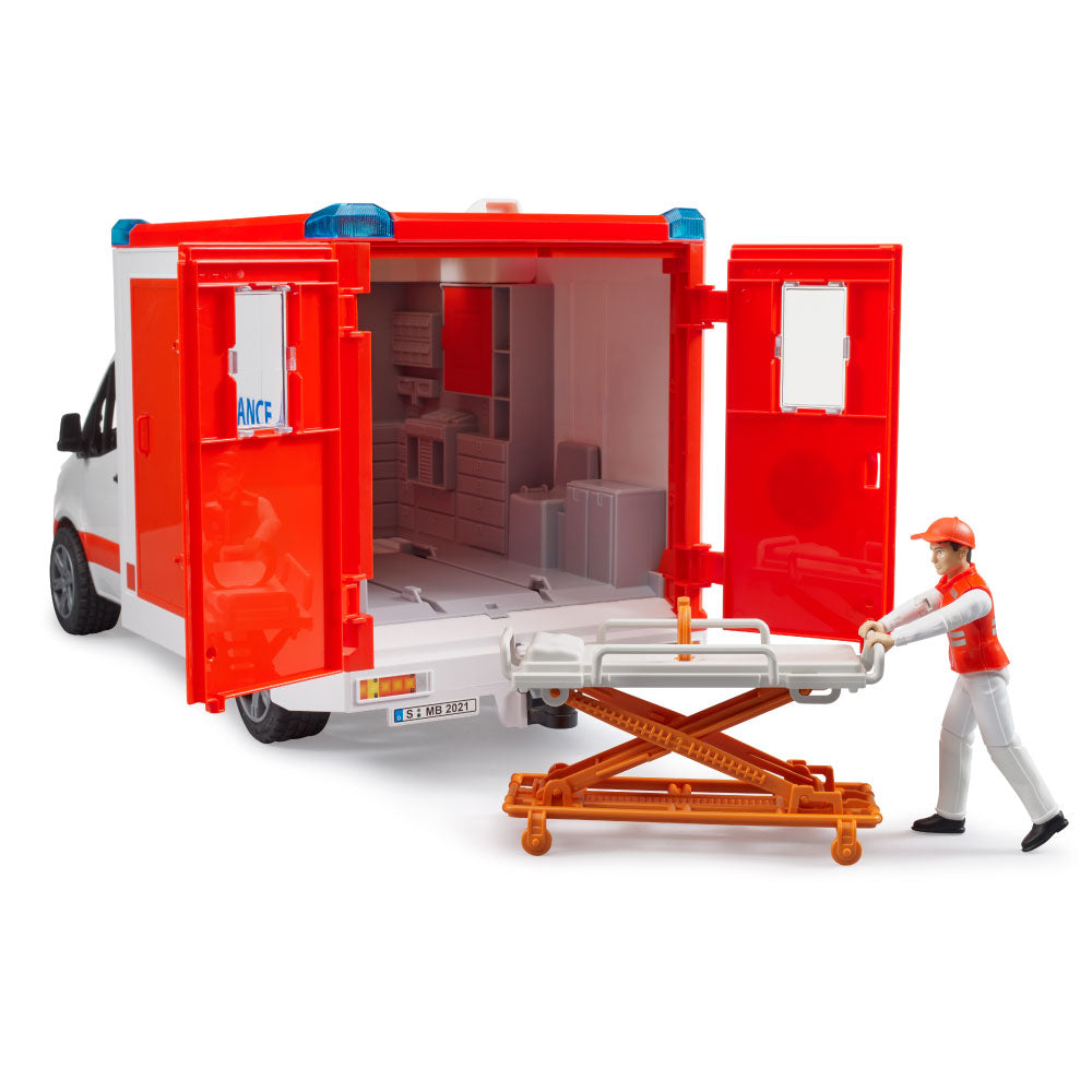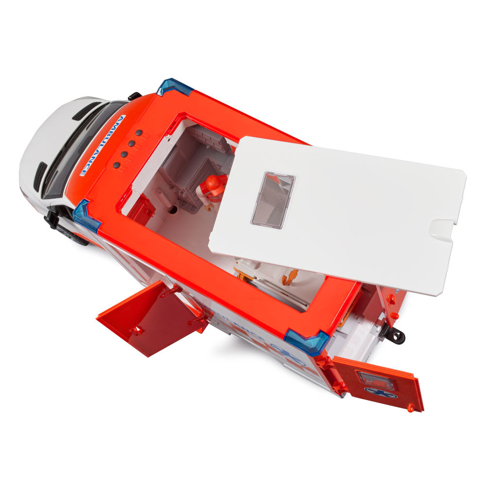 Service vehicles play a very important role at BRUDER. The MB Sprinter ambulance has just been added to this range. Equipped with a large number of functions, this vehicle is a must-have in any emergency situation. The paramedic included in the scope of delivery can access the driver's cab through the opening doors. With the newly integrated light and sound module with various sirens and lights, the ambulance arrives quickly and safely at the scene of the emergency. The little paramedic can access the modern work area through both the opening rear and side doors, as well as the removable roof module. Any bworld figure can be treated on the height-adjustable stretcher that can be removed and inserted again and transported safely, just as the Bruder motto says - Just like in real life! The play value of this large vehicle can be expanded with the accessory set 62710, consisting of a paramedic and a patient, as well as the bworld ambulance (item no. 62711).