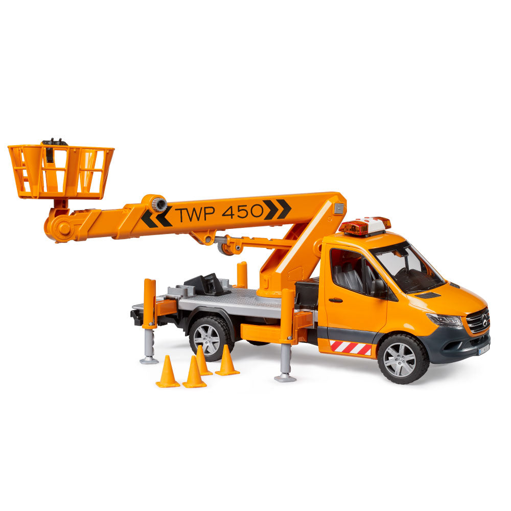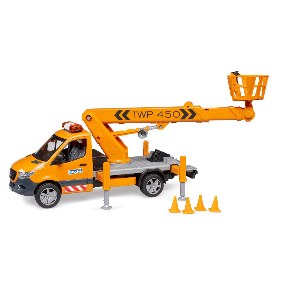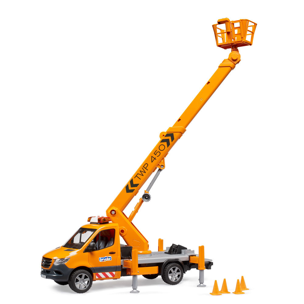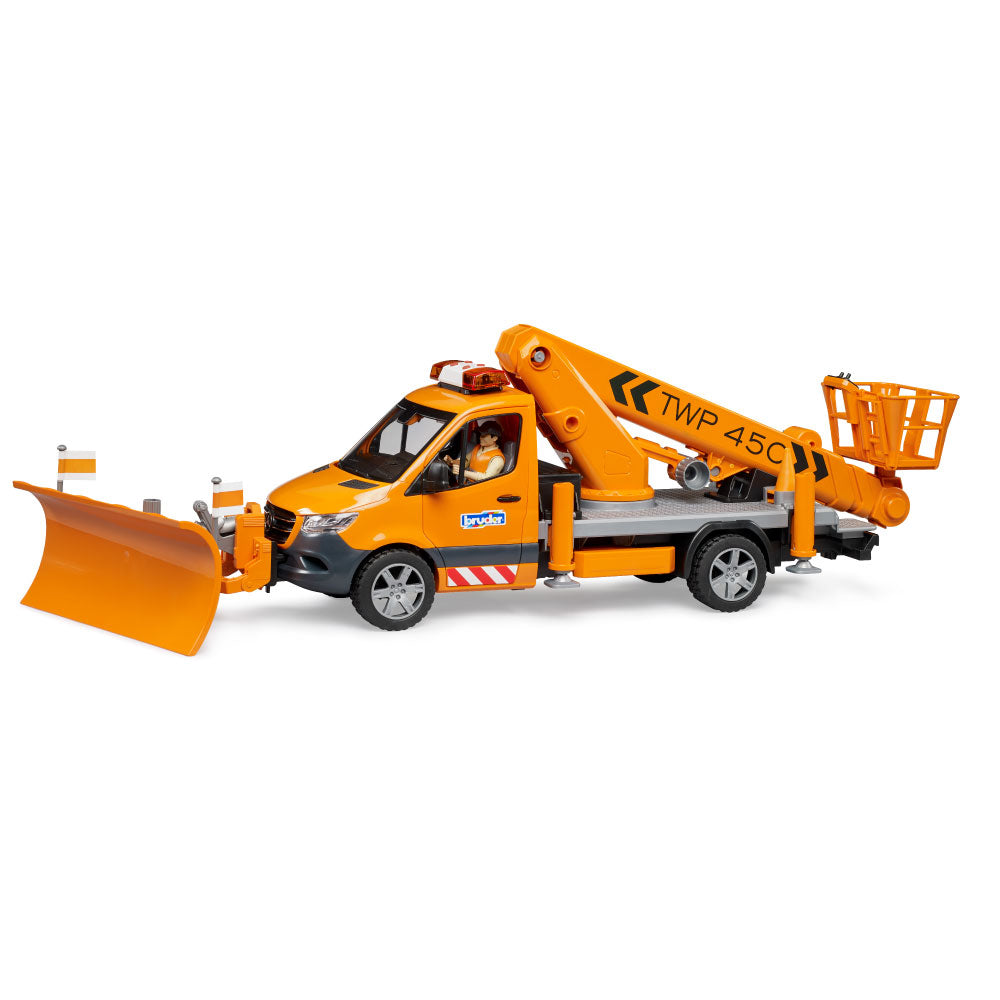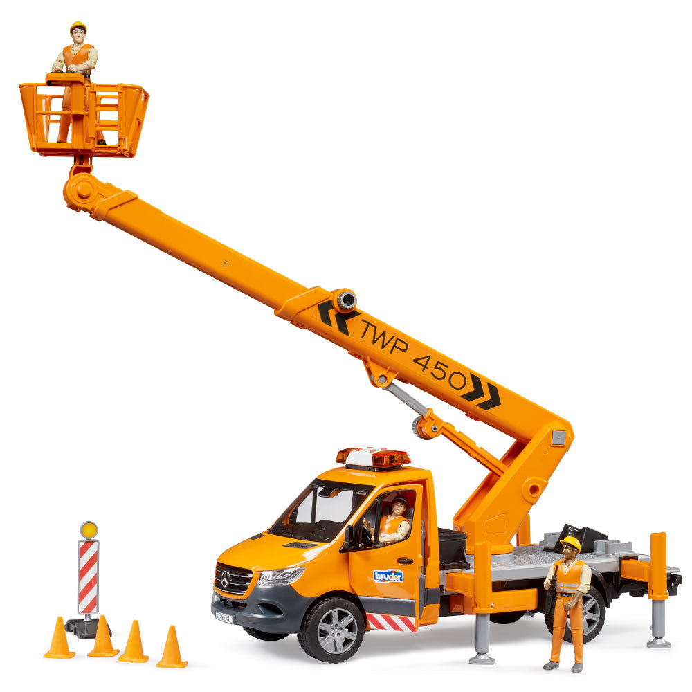 The latest BRUDER variant is the Mercedes-Benz Sprinter with a work platform. Mobile work platforms are essential for working at height, for example, on trees, streetlights, or traffic signs. The BRUDER work platform safely lifts any bworld figure to a height of up to 70 cm! Thanks to integrated technology, the personnel basket always remains horizontal when the crane arm is extended. The vehicle is secured with four extendable support legs, and four traffic cones are included to block access to the work area. Of course, the Sprinter's cab doors can be opened, and a light and sound module is installed for safety and good visibility inside the vehicle. From the extensive Bruder range, this detailed vehicle can be expanded with the Mercedes-Benz Sprinter municipal vehicle (item no. 02677), the bworld municipal worker (item no. 62130) and the construction site set (item no. 62007).