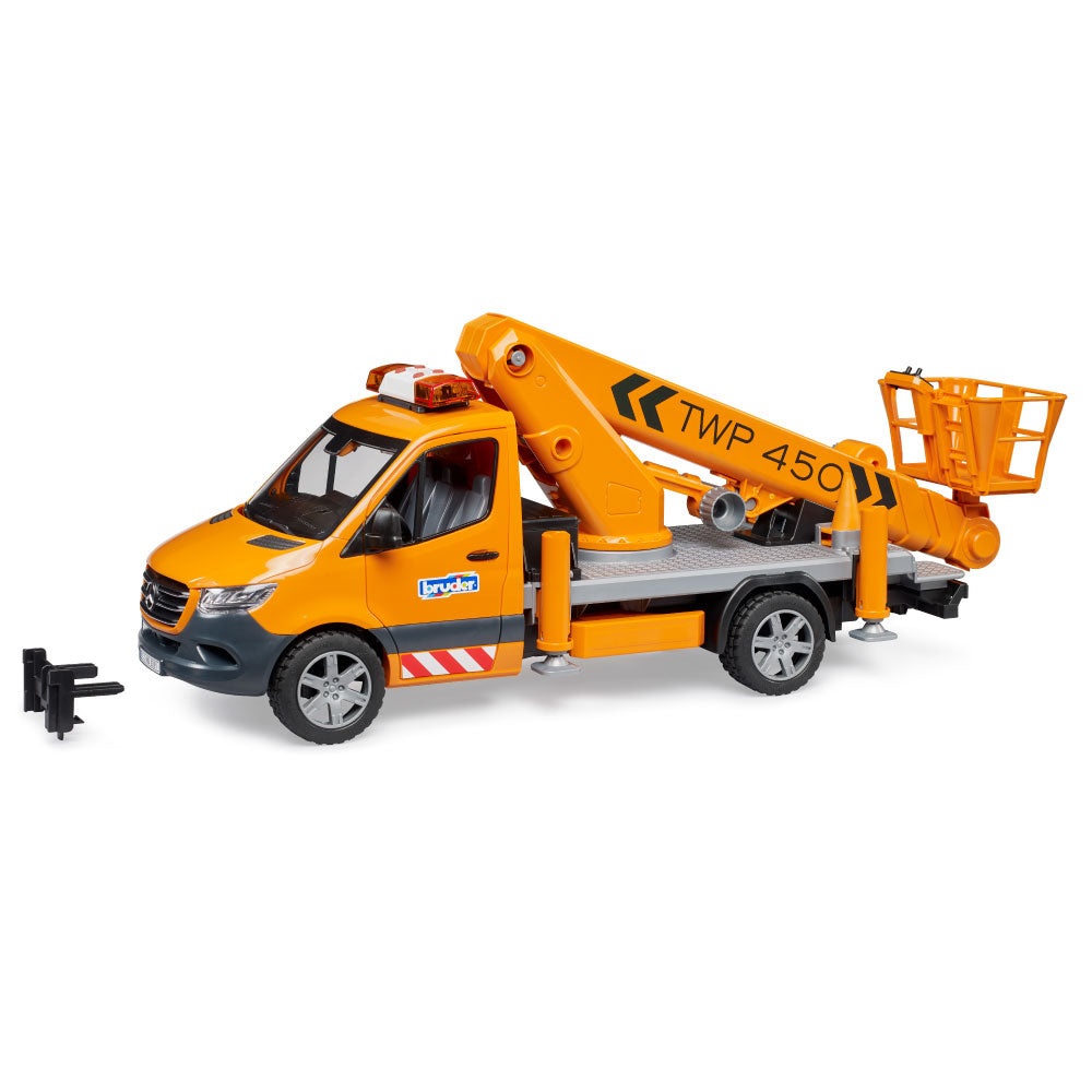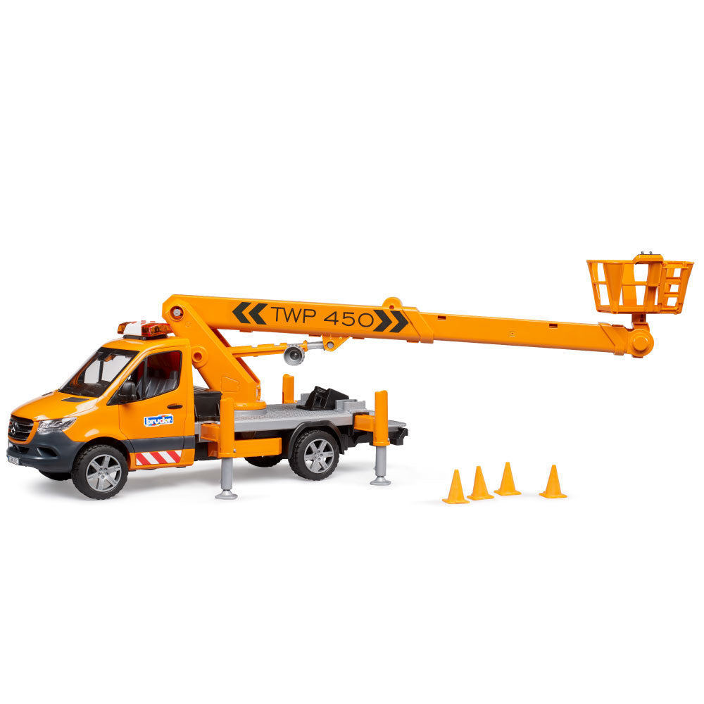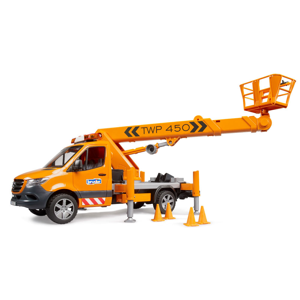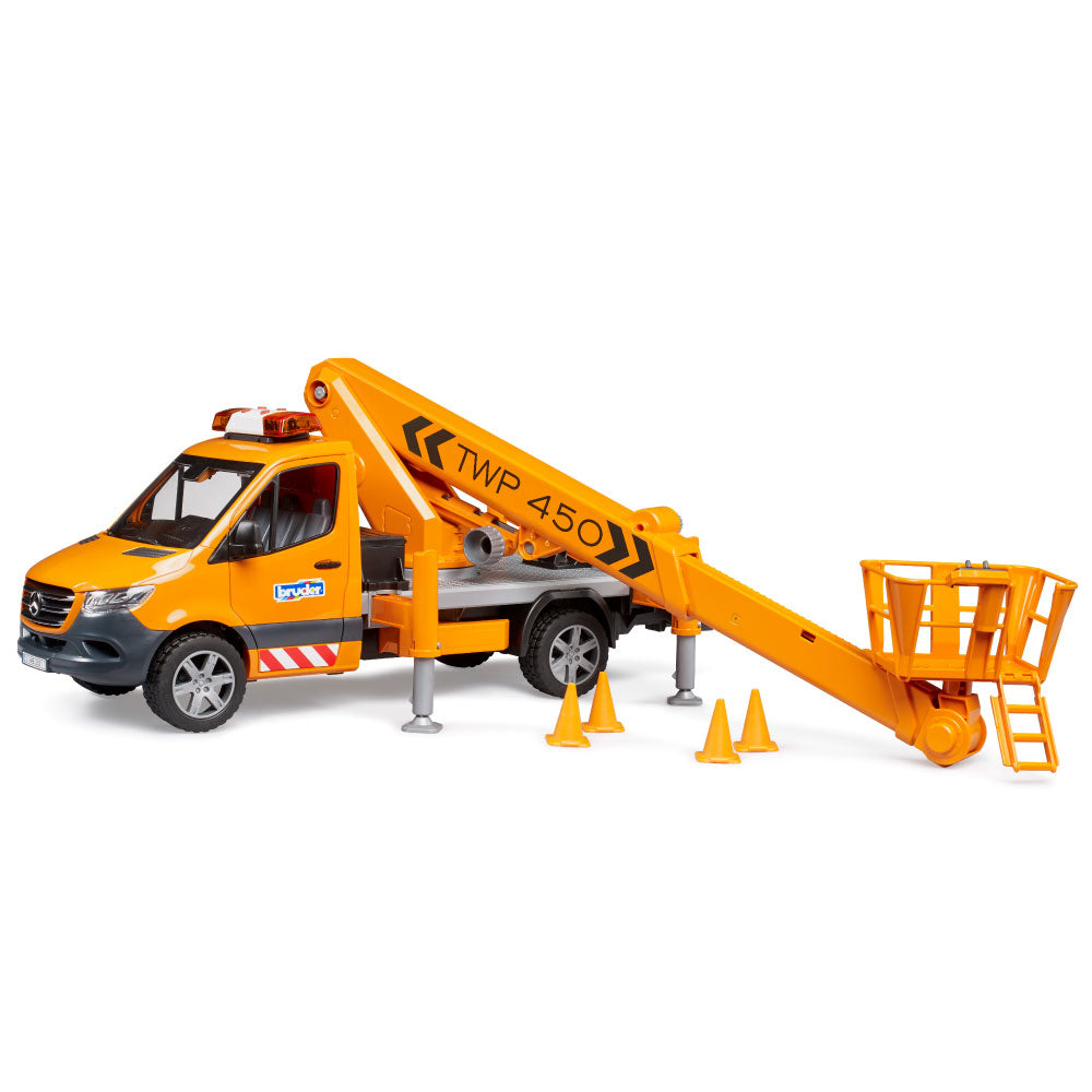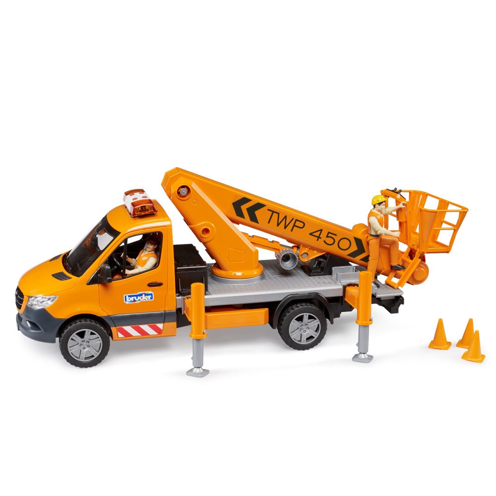 The latest BRUDER variant is the Mercedes-Benz Sprinter with a work platform. Mobile work platforms are essential for working at height, for example, on trees, streetlights, or traffic signs. The BRUDER work platform safely lifts any bworld figure to a height of up to 70 cm! Thanks to integrated technology, the personnel basket always remains horizontal when the crane arm is extended. The vehicle is secured with four extendable support legs, and four traffic cones are included to block access to the work area. Of course, the Sprinter's cab doors can be opened, and a light and sound module is installed for safety and good visibility inside the vehicle. From the extensive Bruder range, this detailed vehicle can be expanded with the Mercedes-Benz Sprinter municipal vehicle (item no. 02677), the bworld municipal worker (item no. 62130) and the construction site set (item no. 62007).