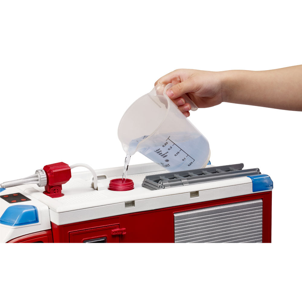The new BRUDER fire truck for firefighters is a true multifunctional piece of equipment for rescue operations. The double cab offers space for up to four bworld firefighters. The fully operational water cannon with water tank and pump extinguishes any fire in no time. A second hose is also available for additional firefighting operations. This versatile vehicle can be expanded with a snow plow (item no. 02581/02582) or a cable winch (item no. 42545). The bworld fire station (item no. 62702) is the ideal addition to this detailed vehicle.