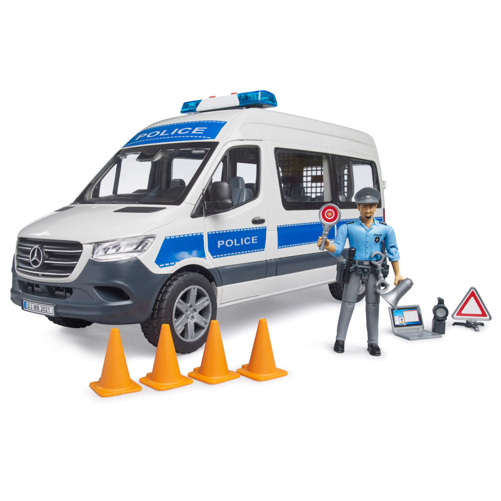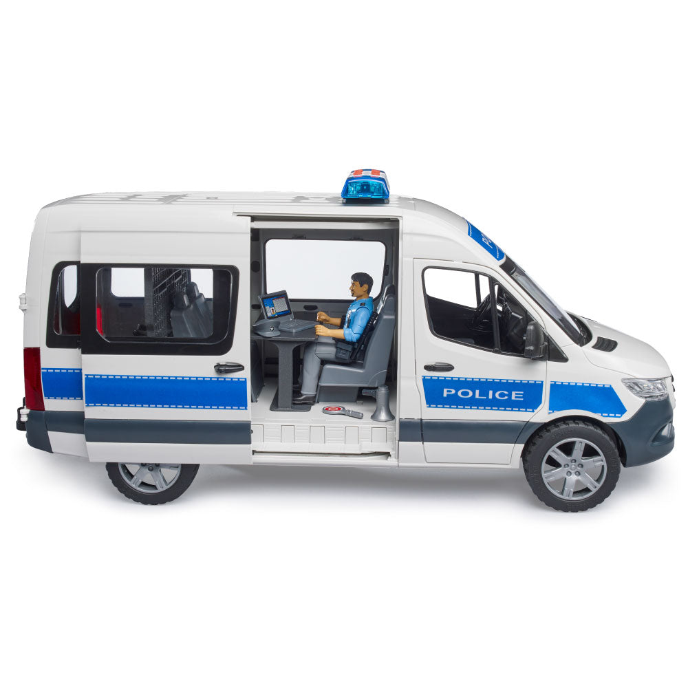 The MB Sprinter, with its wide variety of variants, opens up almost unlimited possibilities for use. This vehicle is also a favorite with the police, who are often involved in a wide variety of operations. The MB Sprinter emergency vehicle is a first for the BRUDER police. With its extensive equipment, including the bworld police station, a wide variety of police operations can be staged, from traffic controls to search and rescue operations. And, if necessary, suspects can even be detained in an isolated cell. The bworld police station (item no. 62732) is the perfect extension for this fully equipped vehicle.