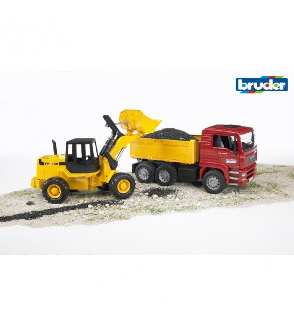 It's essential that both drivers understand each other well and quickly to ensure the most effective work possible. This set includes both a MAN dump truck and a wheel loader, so you can start playing right away. The sides of the dump truck can be folded down to three sides, allowing the transported load to be unloaded in all three directions. The dump body can also be tilted and locked. The FR 130 articulated wheel loader has a movable front axle, and the fully functional loader arm can be locked. The dump truck can also be equipped with the Light and Sound Module (item no. 02801) by simply inserting the module (not included in the scope of delivery).
