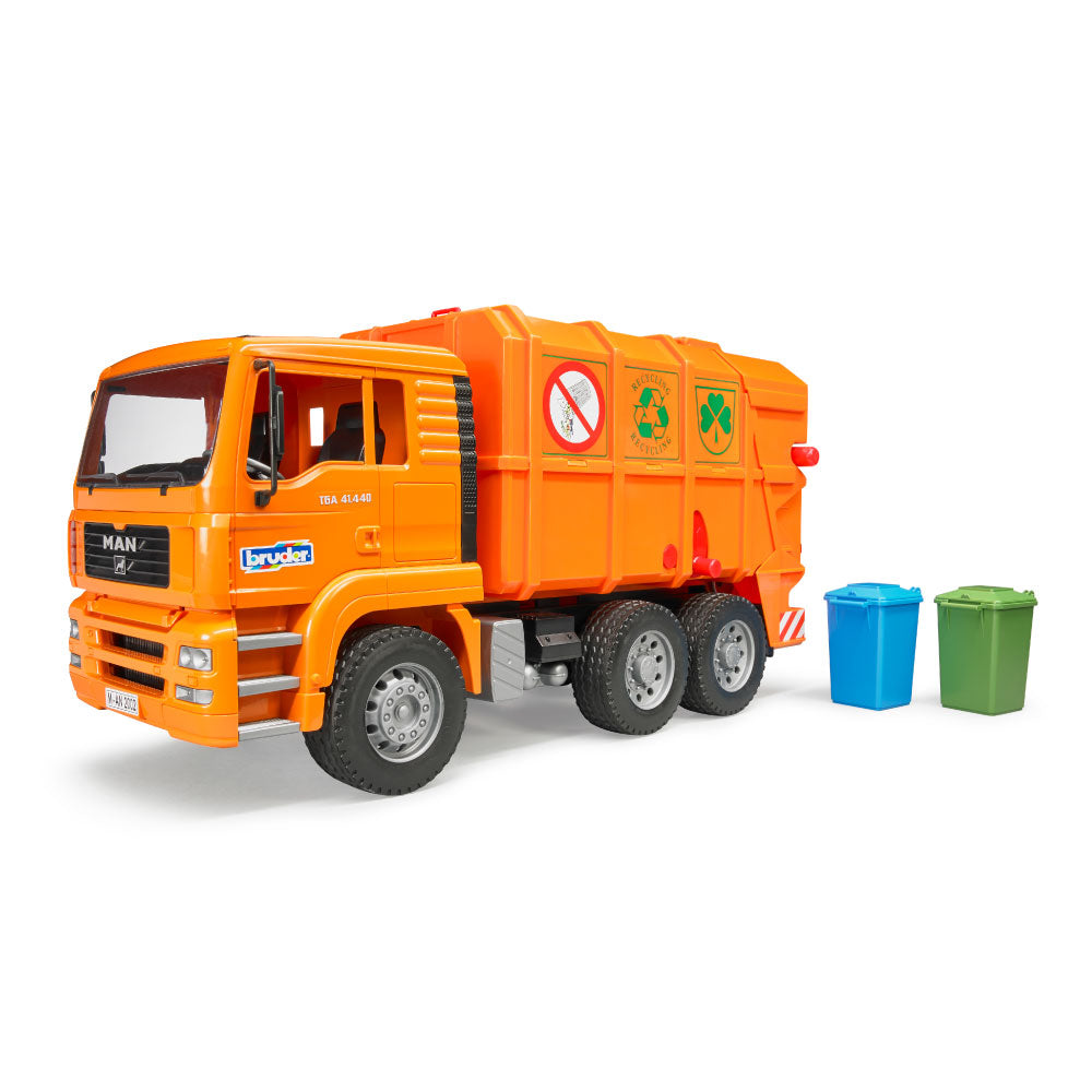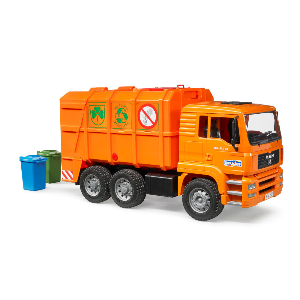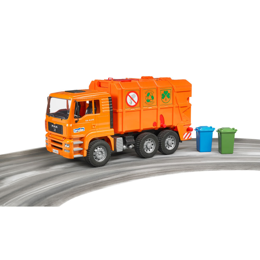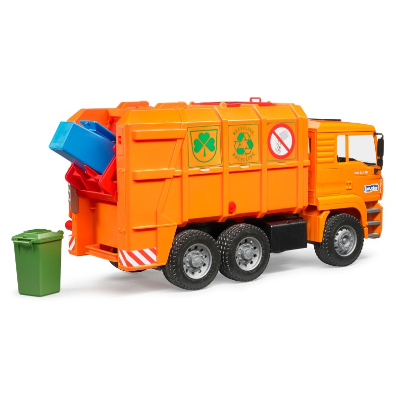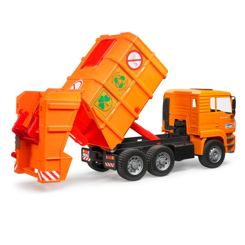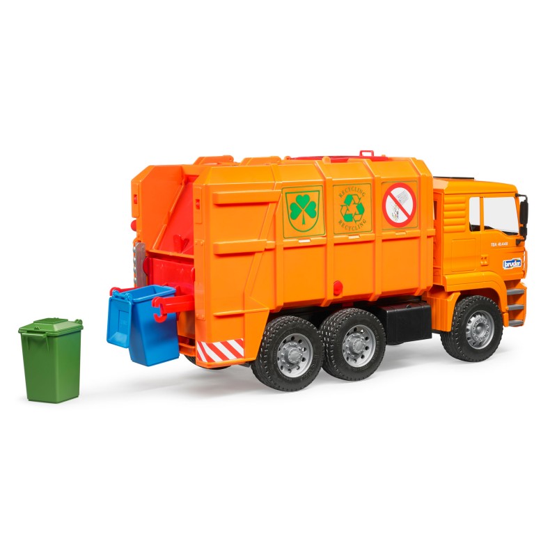 The MAN refuse vehicle's tilting cab provides access to the engine block. The cab mirrors fold in and out. A fully functional tilting mechanism, including a bin lifter, allows you to empty the small, colored bins. The refuse bin can be tilted and features a lever for moving the trash. Empty the bin using the fold-down rear door. Treaded tires complete the product. The MAN TGA refuse vehicle can be upgraded with the refuse bin set (three small, colored bins and one large, gray bin), item number 02607, and the light and sound modules, item numbers 02801 or 02802 (neither included).