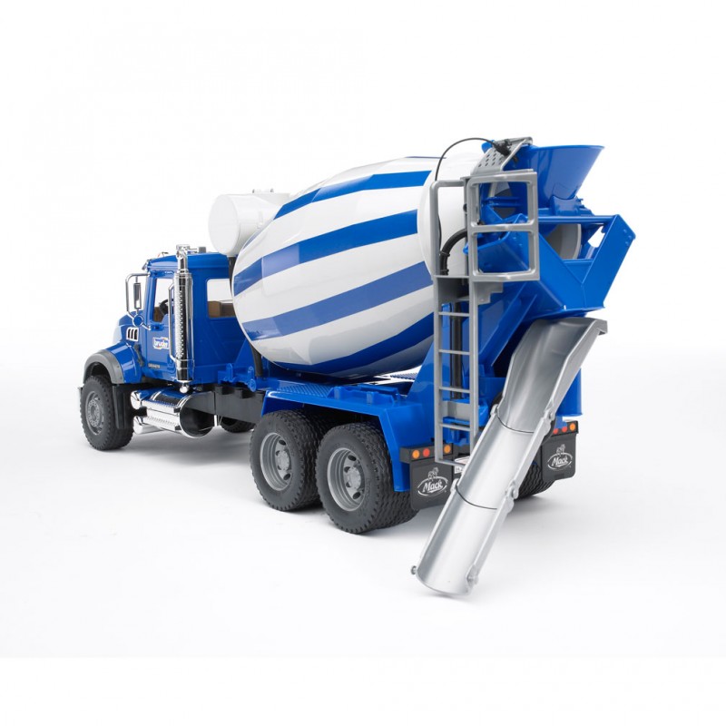 The extremely realistic driver's cab with opening doors, a hinged hood revealing the engine block, fold-down rear mirrors, and numerous chrome-effect attachments truly attracts the attention of not only truck enthusiasts. The concrete mixer drum (a drum with a mixing spiral) can be rotated using an extendable crank immersed in the (simulated) "water tank." Depending on the direction of rotation, the load is either transported into the drum or emptied. Slides mounted on the sides of the structure can be connected to the rear concrete chute to lengthen it.