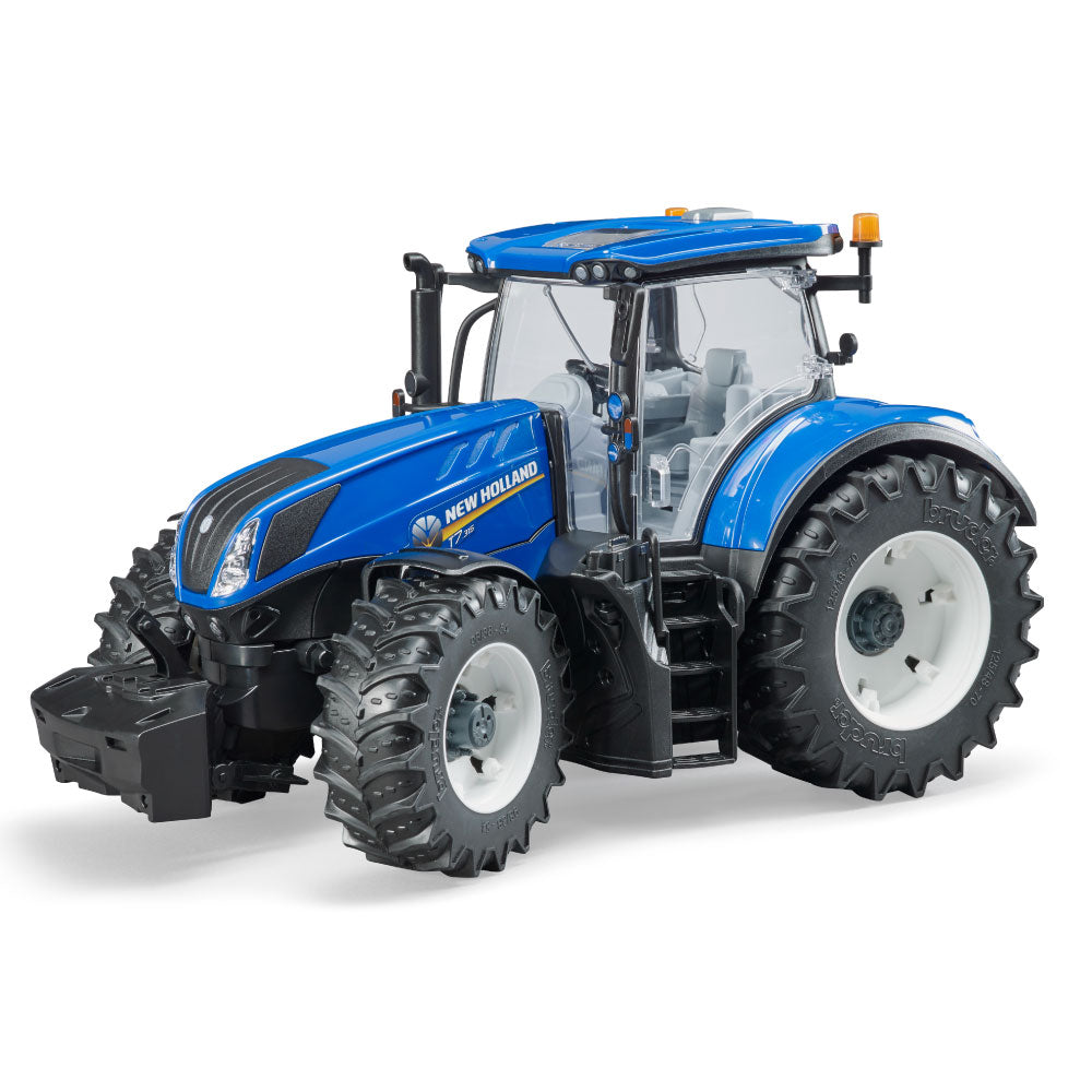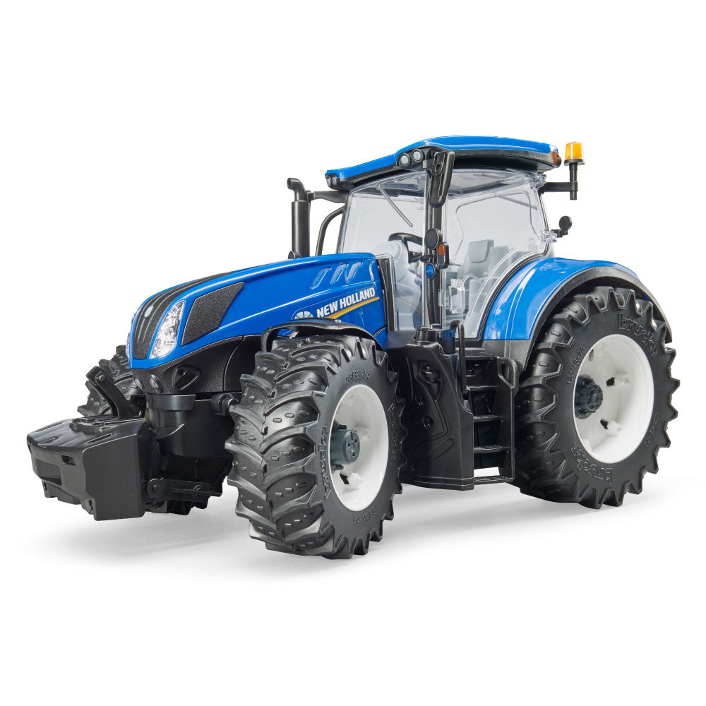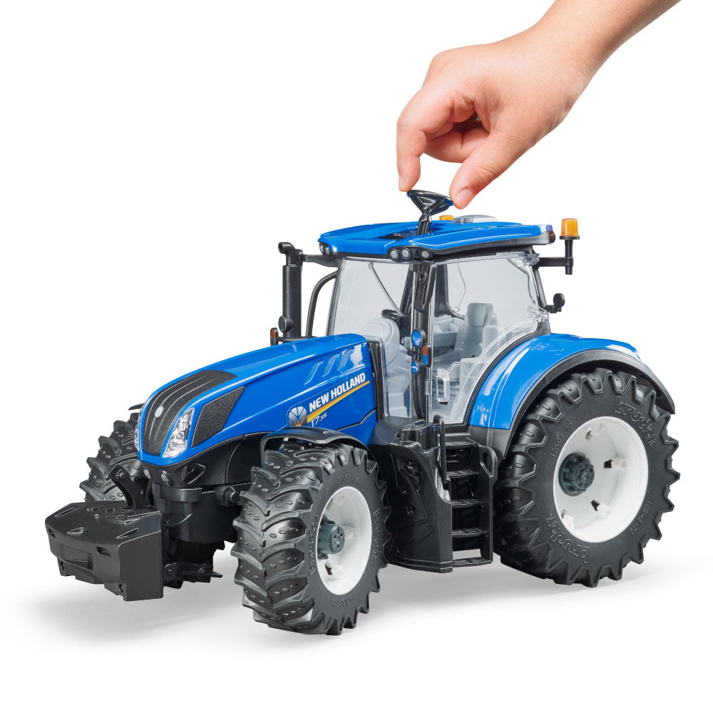 Modern farms require powerful tractors. That's why we designed the New Holland T7 heavy-duty series with a focus on versatility and durability. Up to 340 horsepower can be used with the new New Holland tractor to operate the heaviest implements. With this power, the tractor has enough capacity for pulling, tilling, baling, and transporting tasks. In terms of design, functionality, and quality, the new 1:16 scale Bruder model is just as good as the original, as the motto goes: "Just like in real life!" The driver's cab is fully glazed and the doors can be easily opened. The engine hood can be opened to reveal the powerful engine. Excellent controllability and driving comfort are achieved thanks to the integrated oscillating axle and the steering wheel extension that can be inserted through the sliding roof. A front loader (item no. 03333) can be installed to expand this model. Thanks to the height-adjustable rear coupling, this tractor can be combined with all trailers in the Professional Series. The new removable wheels make play even more fun. Expanding with the Workshop Figure Set (item no. 62100) further increases the fun factor of this great product. It goes without saying that all BRUDER trailers and agricultural implements can be combined with this tractor.