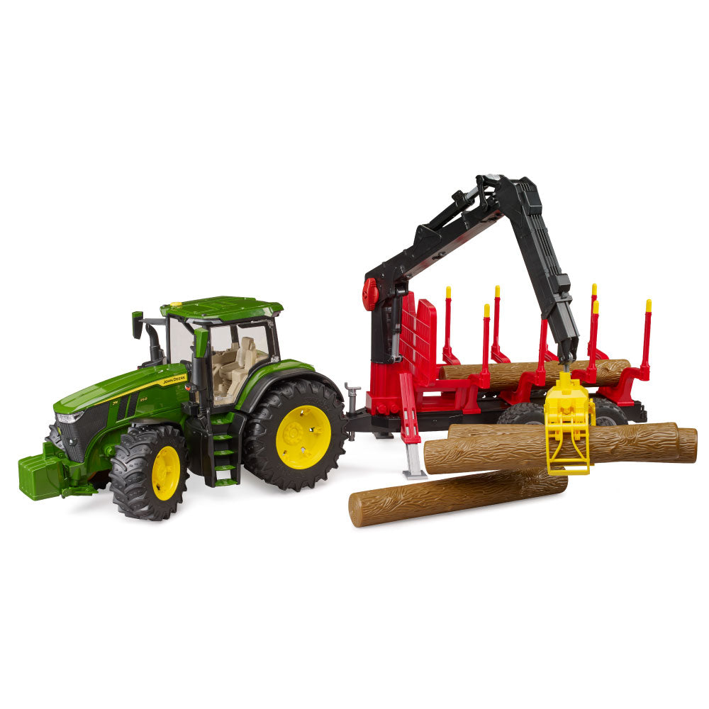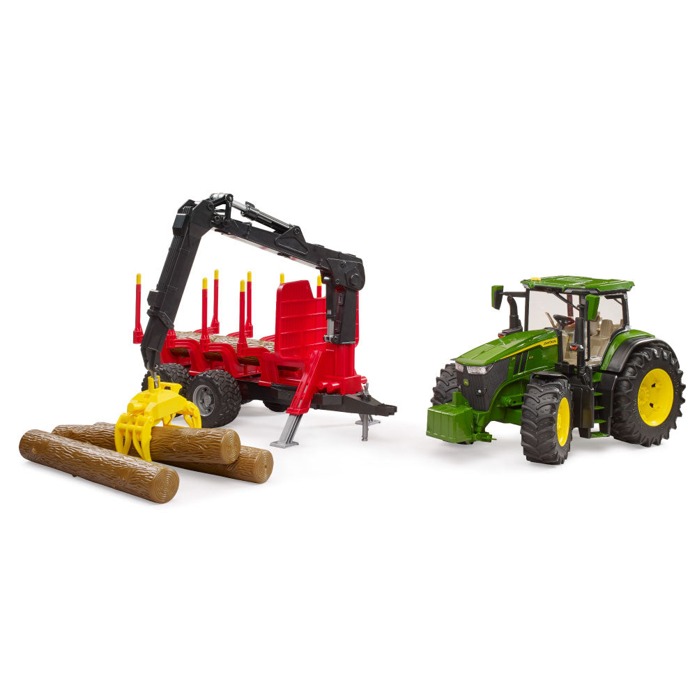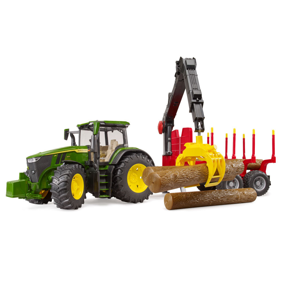 Equipped with four logs, this combination includes a functional self-loading trailer. The model is equipped with a rotating and swiveling loading crane, so the logs can not only be transported but also loaded and unloaded. With adjustable stakes, the modern forestry trailer invites you to start playing right away. Other trailers from the BRUDER agricultural range can also be mounted on this tractor.