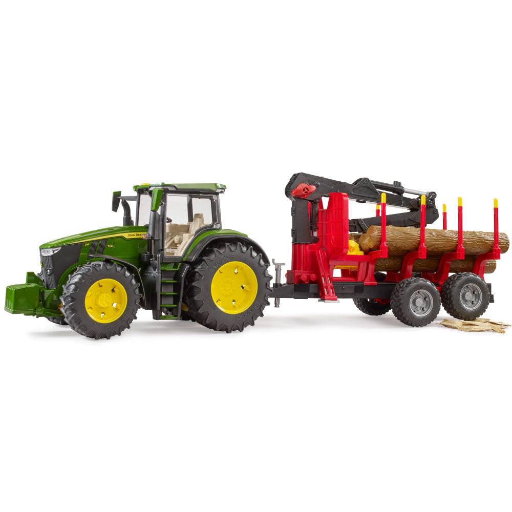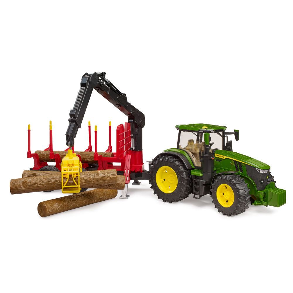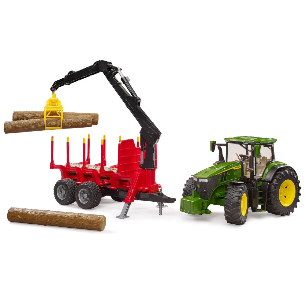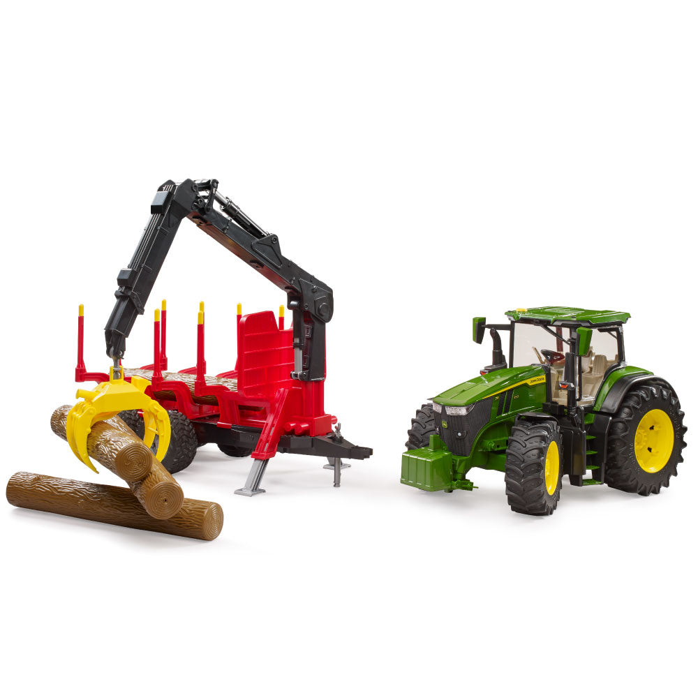 Equipped with four logs, this combination includes a functional self-loading trailer. The model is equipped with a rotating and swiveling loading crane, so the logs can not only be transported but also loaded and unloaded. With adjustable stakes, the modern forestry trailer invites you to start playing right away. Other trailers from the BRUDER agricultural range can also be mounted on this tractor.