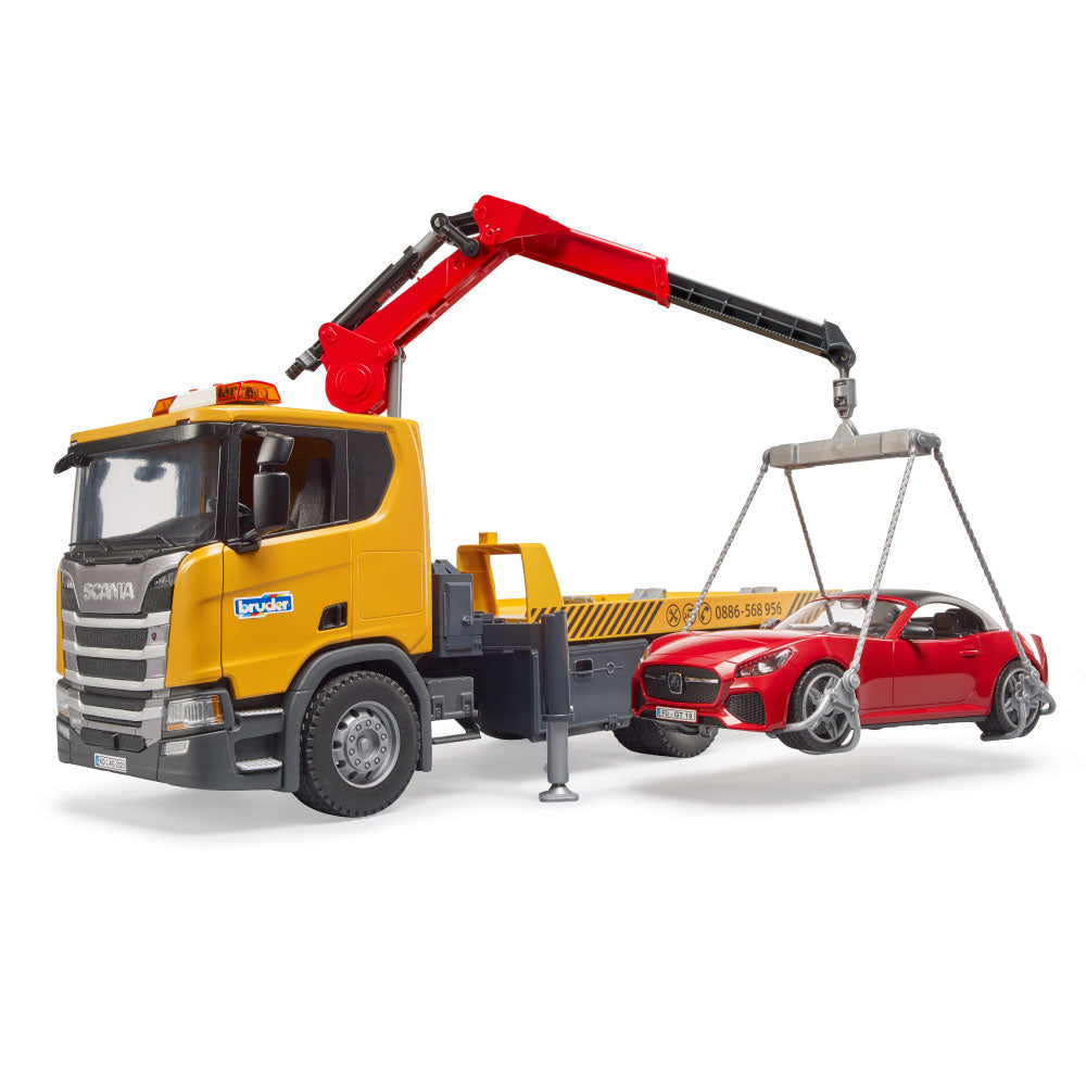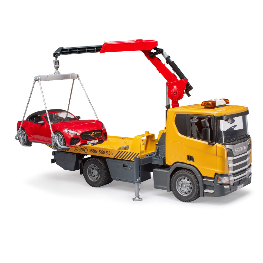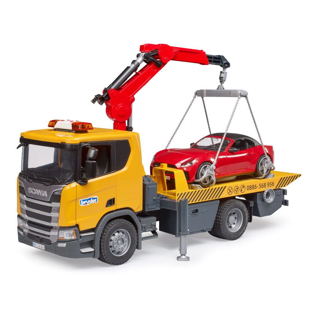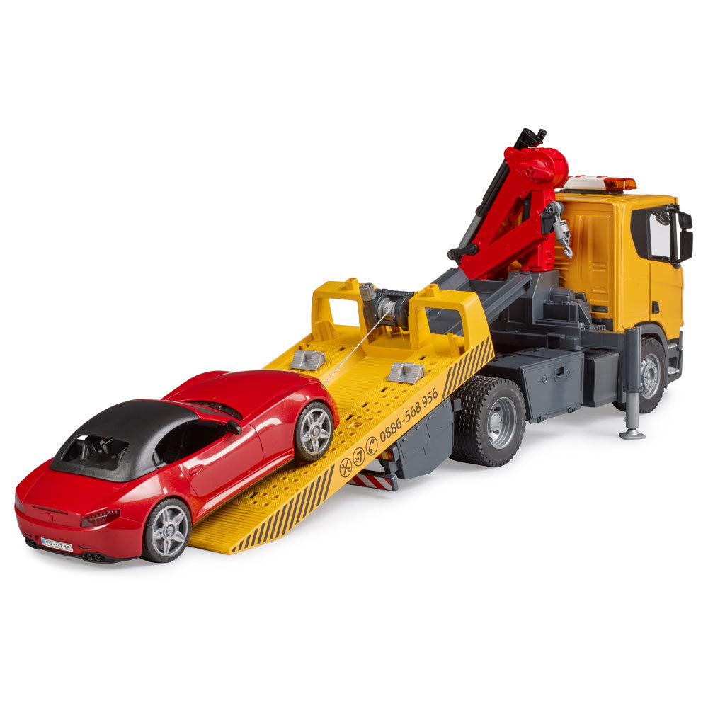 To assist the cars, the platform can be lowered. A car can also be loaded onto the platform with the lifting crane. This crane can be extended and rotated. The loading rigging, consisting of chains and wheel chocks, allows the car to be lifted and loaded quickly and safely. Folding chocks and supports provide a secure hold, and the profiled tires complete the car. True to the original down to the smallest details, the new driver's cab has opening doors and fold-down cab mirrors. The light and sound module is also already installed. The new BRUDER convertible has a removable roof and space for each bworld figure. To further increase the play fun, the BRUDER convertible includes the new wheel change system.