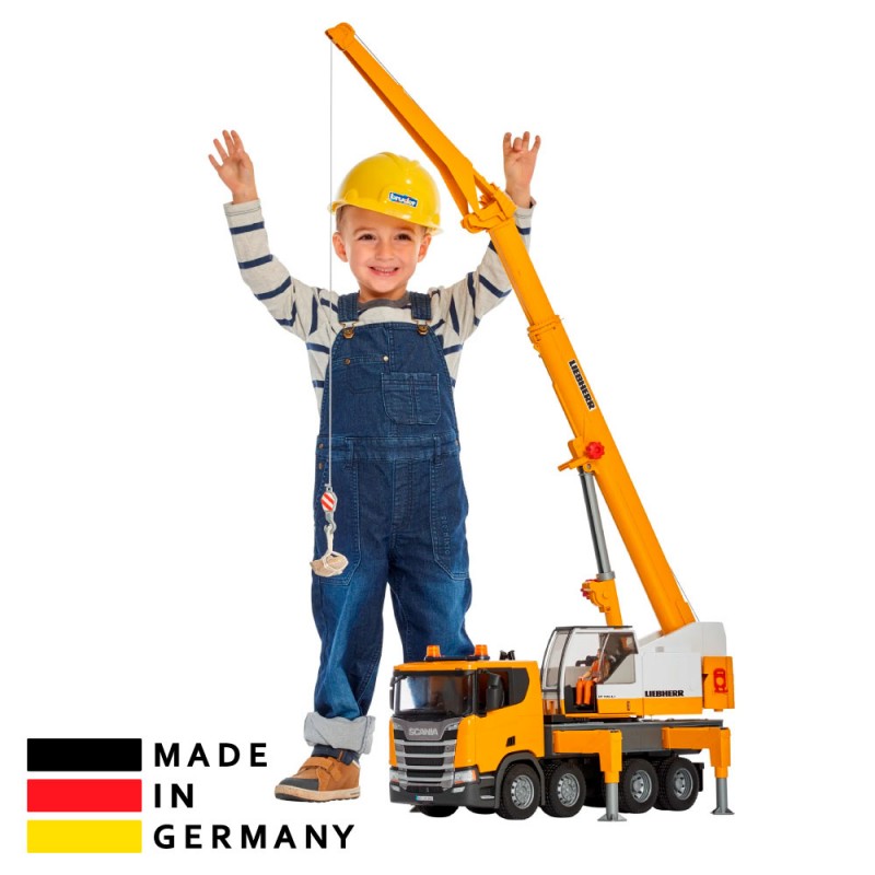 It's precisely these different situations that children can realistically experience with the new BRUDER models. The crane truck is already a considerable size when the telescopic crane is extended and can be further extended with an additional boom. With the crane boom fully extended and raised, the crane measures 1.30 m in height and towers over some of the little builders. Stability in this dimension is, of course, essential. The rotating and individually adjustable support feet on the vehicle platform ensure high stability against tipping. For even greater stability, the included counterweight can be used as with the original crane. The model can be filled with sand to ensure sufficient weight. The cable winch with holding device and overload protection allows easy operation of the crane hook when raising and lowering even large objects. As with the original version, the crane driver's cab has a protective window frame and an openable sliding door. A toolbox integrated into the platform completes the crane's numerous functions. The Scania Super R's new cab features opening doors and folding exterior mirrors. The BRUDER light and sound module is also included for even greater play value.
