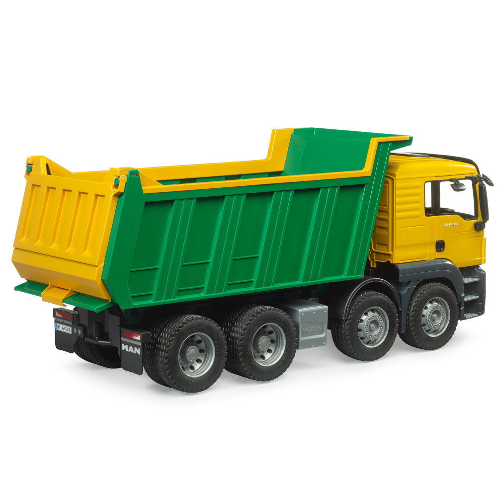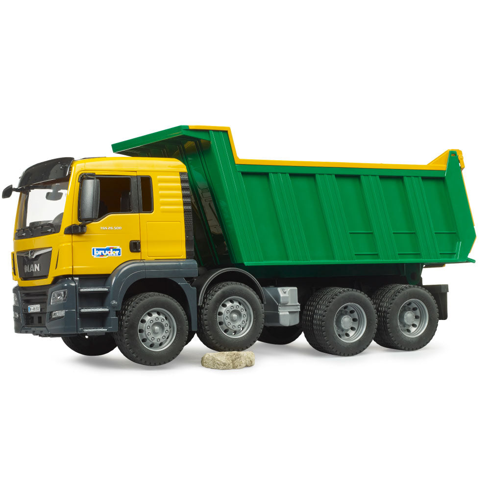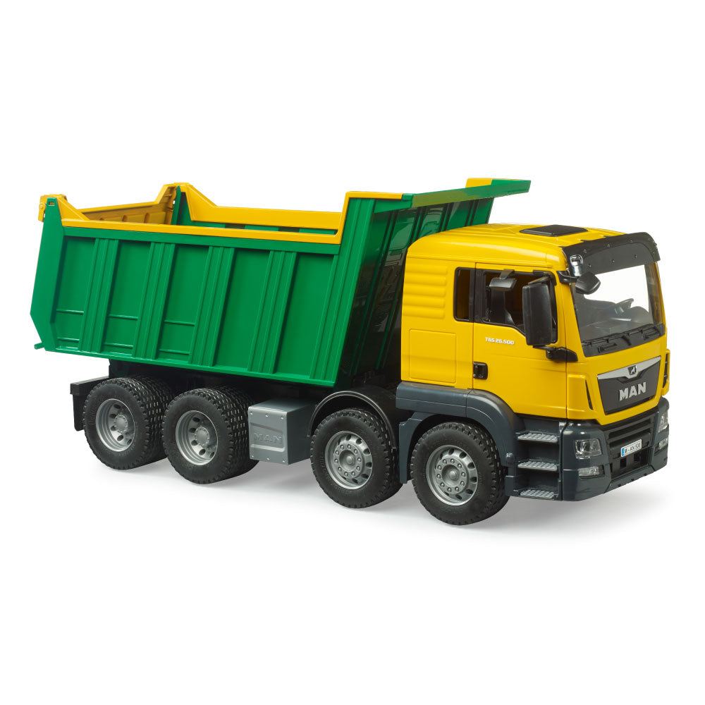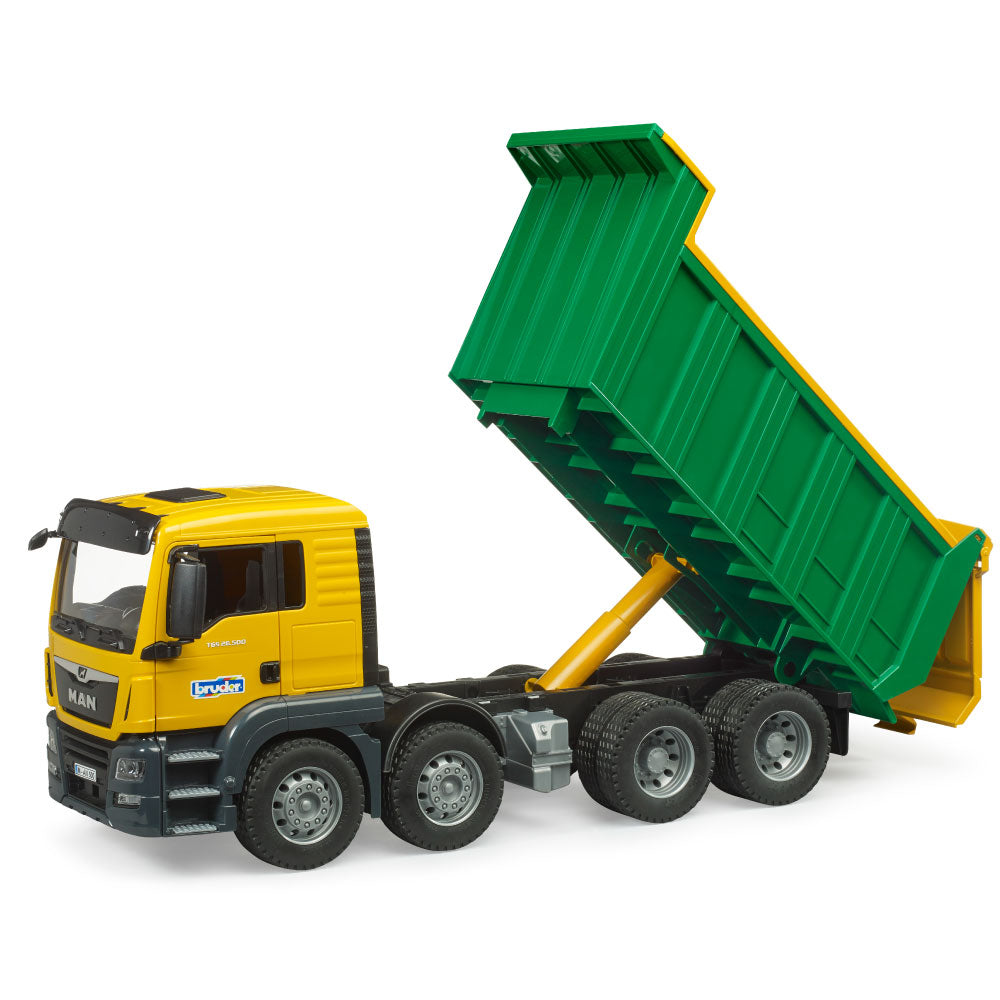 The truck's large box has a tailgate that opens automatically when the load is tipped. For intensive use, the MAN tipper is equipped with four axles and robust profiled tires. The Cat® wheeled excavator (item no. 02445) and the JCB 5CX backhoe loader (item no. 02454) from the extensive BRUDER construction machine range are particularly suitable for this purpose.