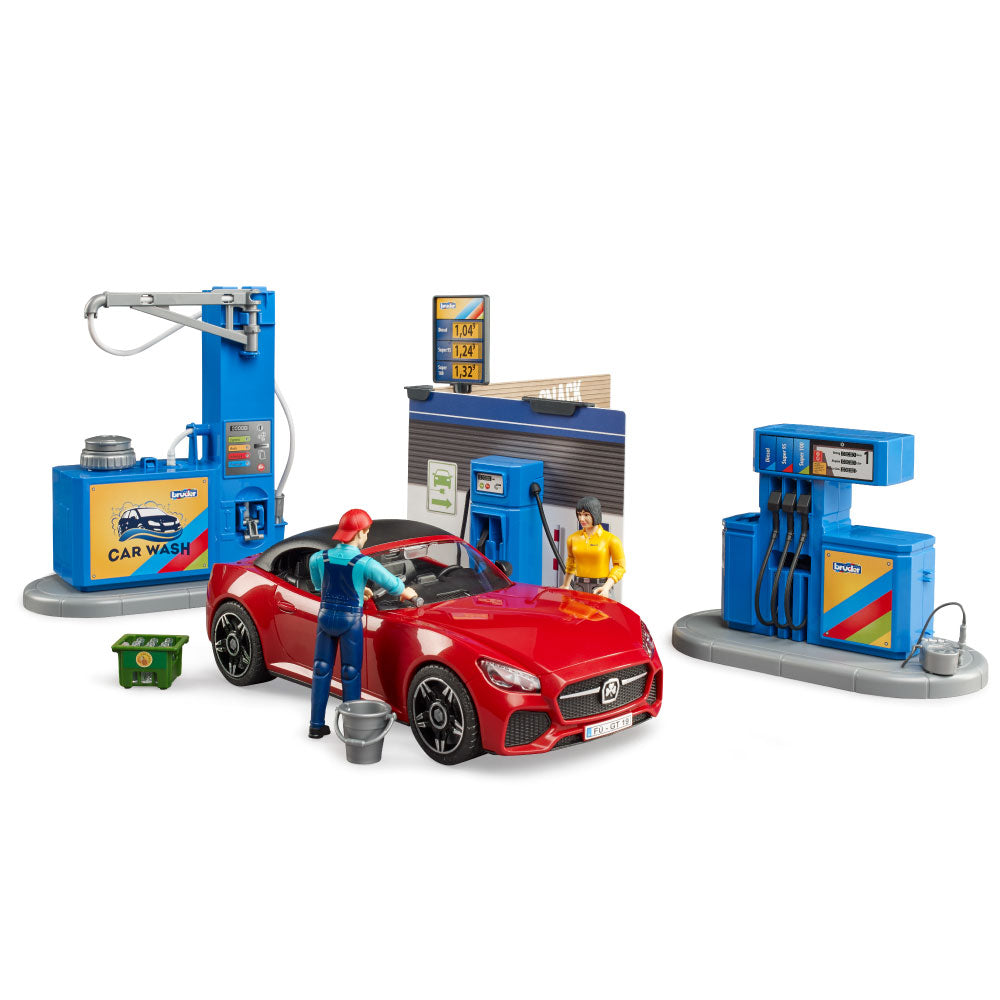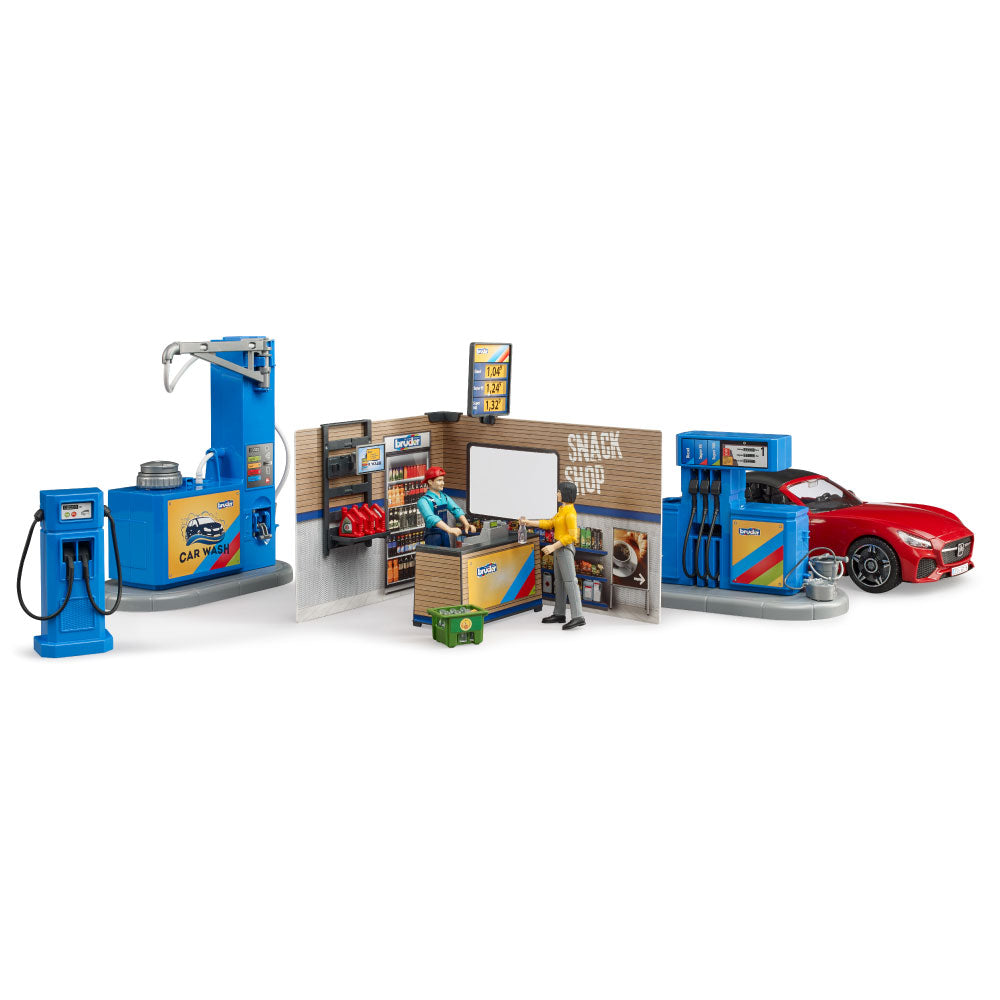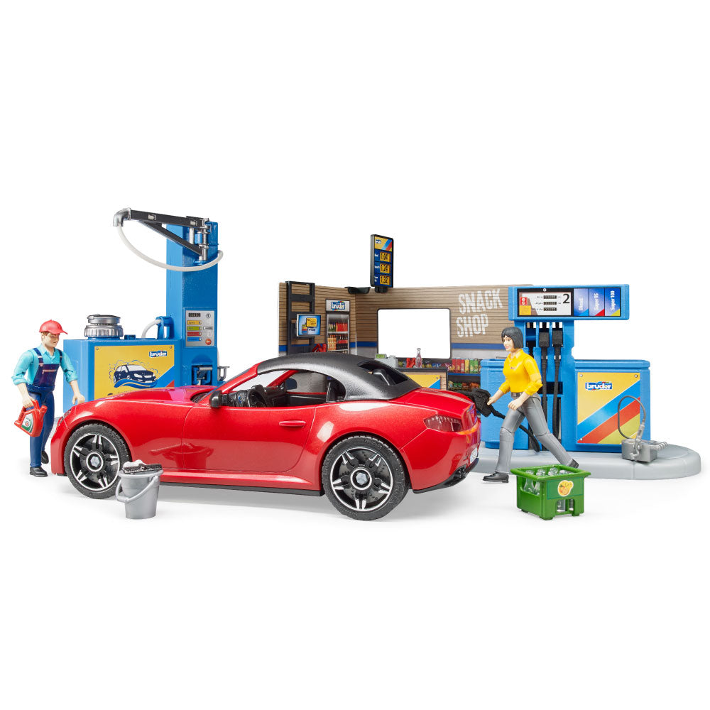 The BRUDER convertible and its driver, who is a gas station customer, complete this set. From the extensive BRUDER range, the bworld car workshop (item no. 62110), the bworld motorcycle workshop with the Ducati Full Throttle Scrambler (item no. 62102), and the MAN TGS crane truck (item no. 03750) are particularly well-suited.