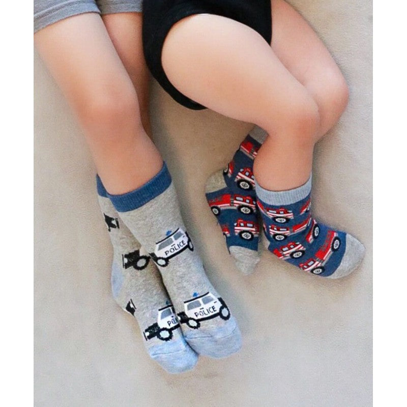 Be a hero to your little one with these fire truck and police car socks! Big kids, toddlers, and babies all love these socks! Each pack includes 1 fire truck, 1 police car, and 1 striped sock. These are perfect for playing dress-up or just for everyday wear.