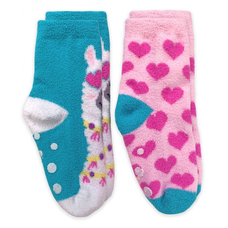 Fun and fuzzy girls' slipper socks keep feet cozy and warm! Cute and colorful pattern designs include a llama with cute glasses and hearts. Super soft and comfortable for everyday wear. Non-slip grippers on the bottom of the socks prevent feet from slipping on the floor. Fuzzy slipper socks make a great birthday gift, Valentine's Day gift, or stocking stuffer.