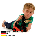 The Linde H30D forklift is an industrial forklift whose real-life model runs on diesel or gas. The impressive original Porsche design makes for a highly attractive toy model. The forklift is equipped with a double lift mast, whose lift and tilt functions can be operated with one hand. Hydraulic tilt cylinders mounted on the roof are used to adjust the tilt of the lift mast. The model features easy-to-use steering, allowing children to load just like the original in extremely confined spaces. Naturally, the forks are adjustable and removable. Two Euro pallets are included in the scope of delivery. Profiled tires complete the package. Thanks to the included trailer coupling, the forklift can be combined, for example, with a trailer. with single-axle trailers, Art. No.: 02244 and Art. No.: 02027. In addition, the forklift can be equipped with the set with Art. No.: 02008 consisting of a basket pallet, a wire rope winch, forks, loading forks (not included in the scope of delivery).