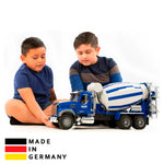The extremely realistic driver's cab with opening doors, a hinged hood revealing the engine block, fold-down rear mirrors, and numerous chrome-effect attachments truly attracts the attention of not only truck enthusiasts. The concrete mixer drum (a drum with a mixing spiral) can be rotated using an extendable crank immersed in the (simulated) "water tank." Depending on the direction of rotation, the load is either transported into the drum or emptied. Slides mounted on the sides of the structure can be connected to the rear concrete chute to lengthen it.