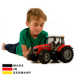 The MF 7600 tractor series not only won the "Machine of the Year 2012" award in the premium tractor category (180 to 260 hp) at Agritechnica, the German agricultural technology industry trade fair, but also, for example, the "Tractor of the Year for Design 2012" award and a host of other international accolades. It's no surprise, then, that this powerful machine is represented in BRUDER's most powerful tractor class (PREMIUM-PRO). The model features all the characteristics that define this tractor group, such as a glass cab, opening doors and engine hood, and steering via an additional tie rod inserted through the tractor roof. The all-terrain oscillating axle enhances agility, while the removable front weight and front loader mount make the tractor a truly versatile and highly flexible tractor. The height-adjustable trailer coupling allows the model to be upgraded with BRUDER accessories and couplings, allowing for a complete day's tractor driver enjoyment. The necessary figures can also be found in the comprehensive BRUDER catalog.