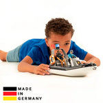 Gracias a su maniobrabilidad y versatilidad, la lancha policial con consola de control es un ayudante importante en la vida cotidiana de la Policía. Para que los niños puedan recrear estas misiones lo más cerca posible de la realidad, el barco de Policía BRUDER es, por supuesto, flotante y está equipado con una luz alrededor.