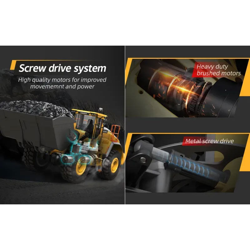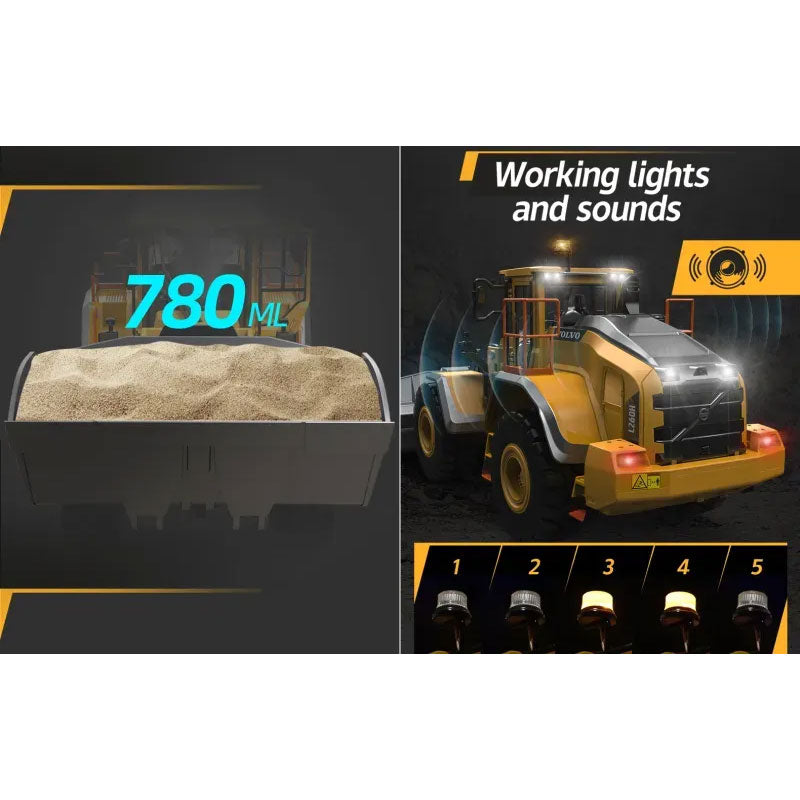 Presentamos la versión mini a control remoto de la cargadora de ruedas Volvo L260H a escala 1/16. Este modelo está fabricado con plástico ABS resistente e incluye piezas de aleación, como la pala, el brazo y los pasamanos. Alimentado por una batería de 7,4 V, cuenta con un fiable sistema de transmisión por tornillo capaz de levantar hasta 5 kg y extender el brazo hasta una altura de 35 cm. Diseñado para una experiencia de juego inmersiva, este modelo de Volvo puede superar pendientes de hasta 35 grados y sortear obstáculos gracias a su suspensión pendular. Con un ángulo de giro de 35 grados, ofrece una maniobrabilidad impresionante. Mejora tu experiencia de juego con el control total de las luces de advertencia en 4 modos dinámicos. Disfruta del realismo inmersivo de nuestro sistema de sonido integrado, con sonidos de cargadora de ruedas totalmente realistas.